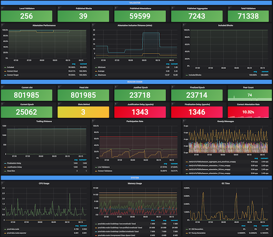 Provides a dashboard for monitoring one or more Teku nodes which are all on the same beacon chain. The required data is exported directly from Teku to a Prometheus data store. See the documentation on how to configure Teku and Prometheus.