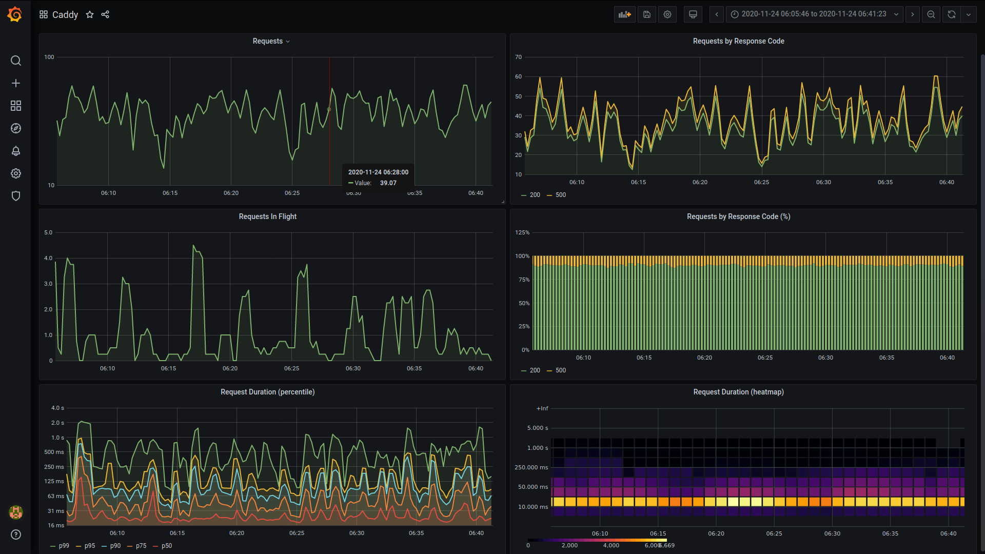 Some basic caddy http metrics dashboard. Please recheck the queries, the initial version is not tested in production yet. Please expect subsequent fixes.