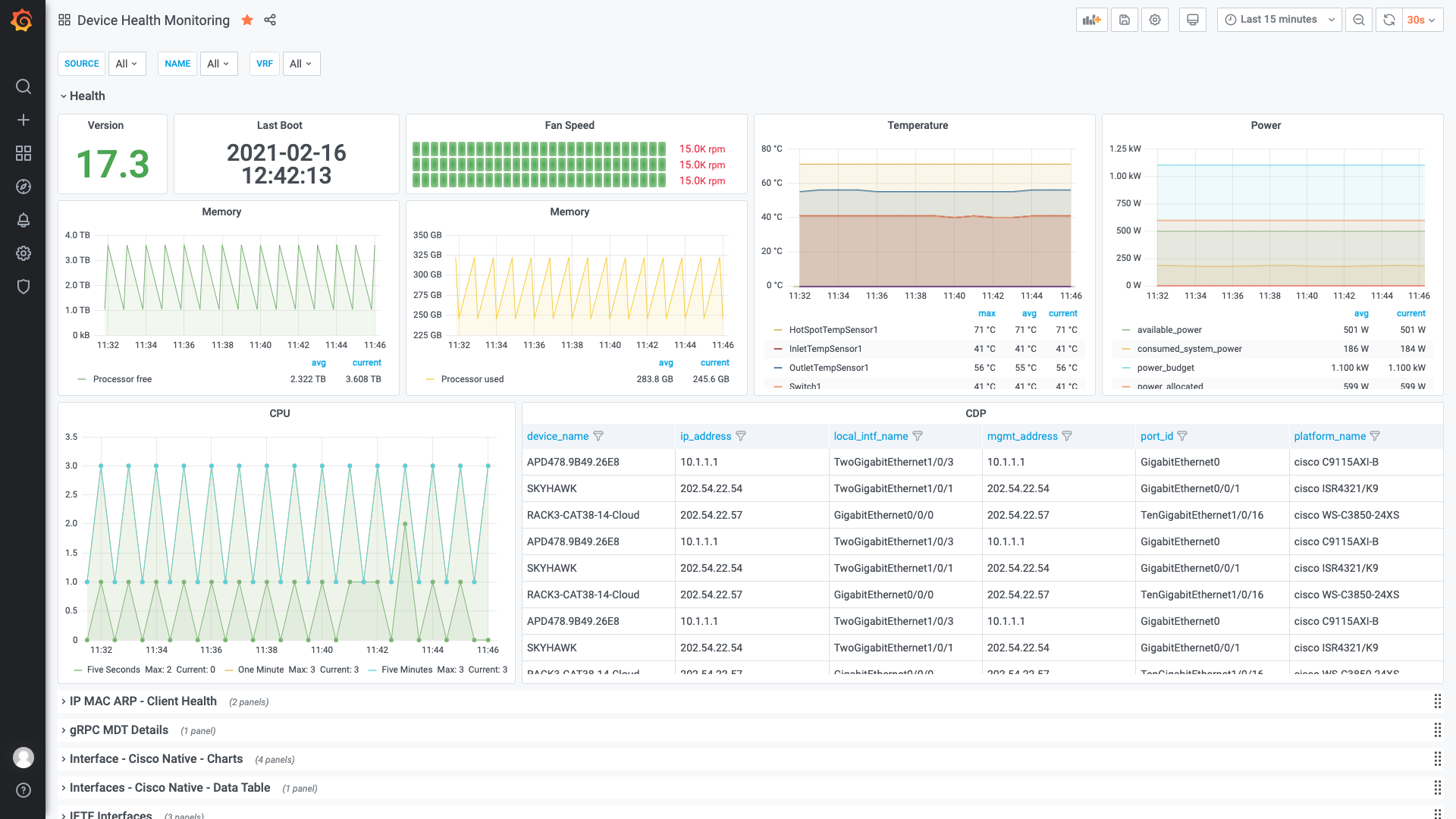 Cisco IOS XE and the Catalyst 9300 switch using the gRPC Dial-Out Model-Driven Telemetry interface to provide basic health and interface monitoring capabilities