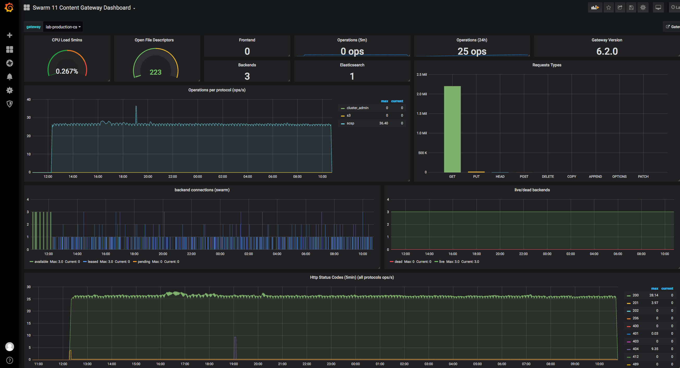 This dashboard is an example of how to visualize metrics provided by Caringo Swarm Content Gateway v7.1.0 and above. Note: some statistics will only show a value once you have done some S3 operations against the gateway.