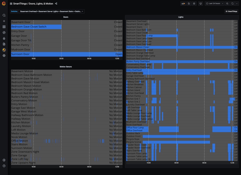 A SmartThings dashboard for contacts, motion, and switches utilizing the SmartThings Metrics Prometheus exporter: https://github.com/moikot/smartthings-metrics