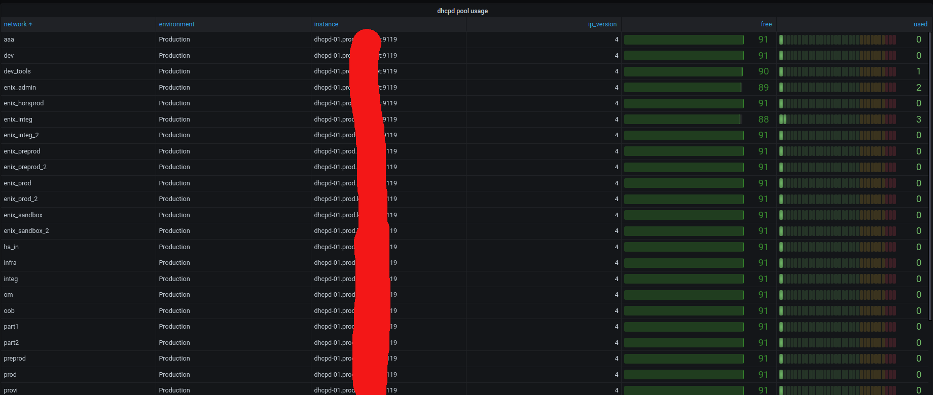 The 9119 - Dhcpd dashboard uses the prometheus data source to create a Grafana dashboard with the table panel.