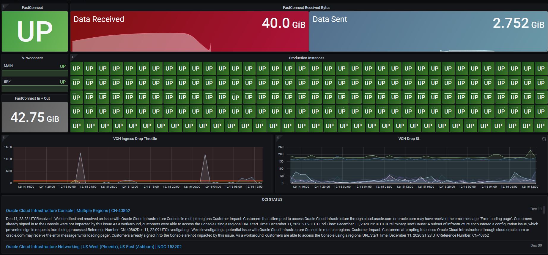 Dashboard provides a comprehended view of principal services of an OCI deployment Connectivity: FastConnect and VPNConnect Production: Instance states for production environment. OCI status last updates