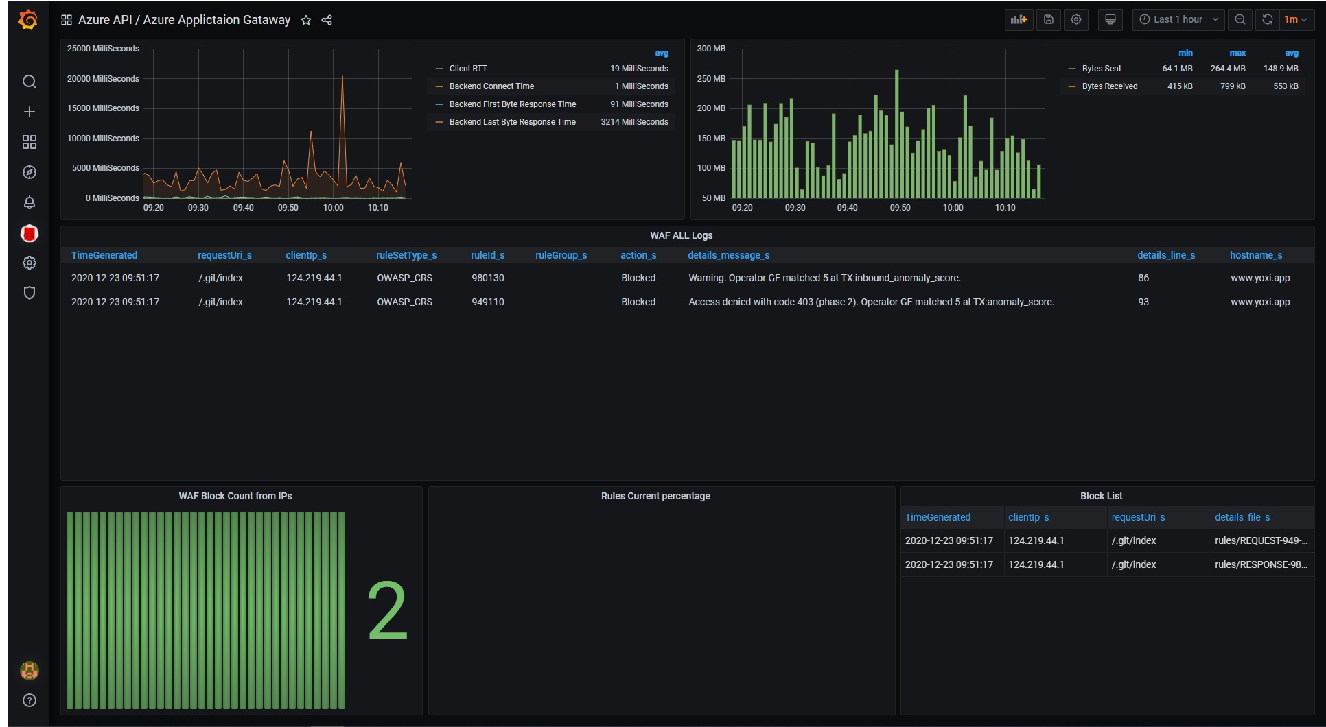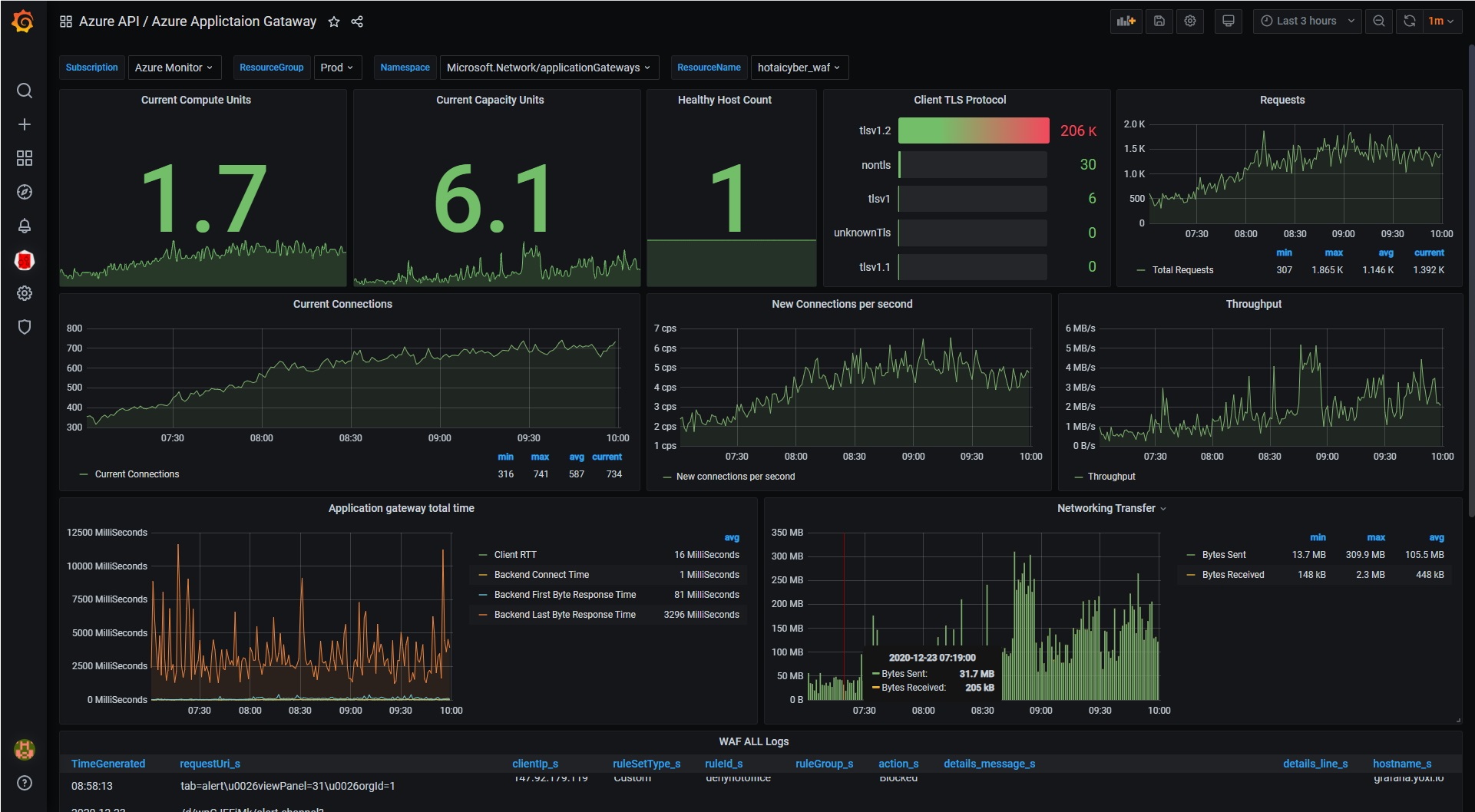 The Azure Applictaion Gataway dashboard uses the grafana-azure-monitor-datasource data source to create a Grafana dashboard with the bargauge, grafana-piechart-panel, graph, stat, table and table-old panels.