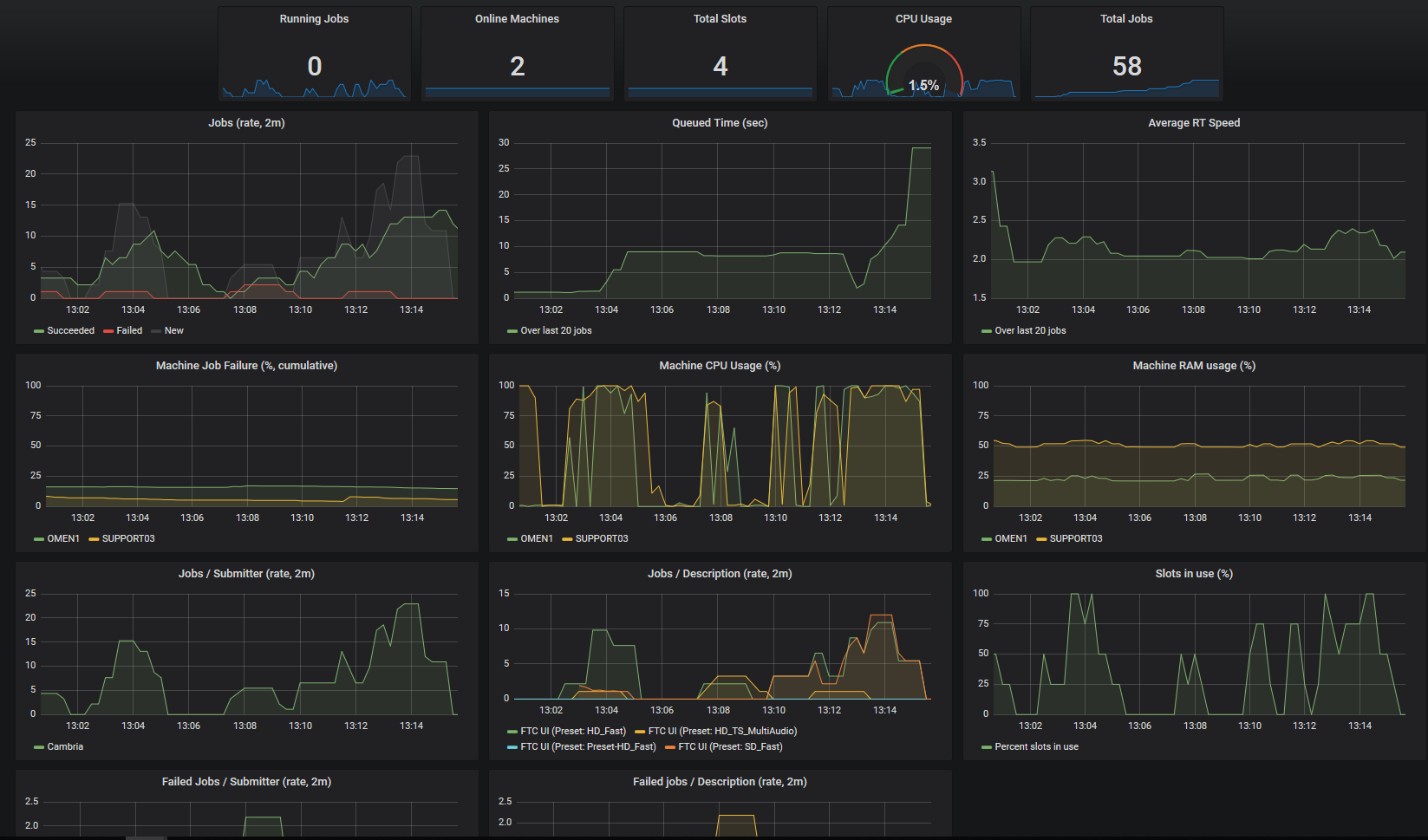 Shows rate of incoming, successful and failed video transcoding jobs for the Cluster. Displays performance graphs such as overall CPU usage, per-machine RAM and CPU usage. Breaks down incoming and failed jobs per preset and submitter.