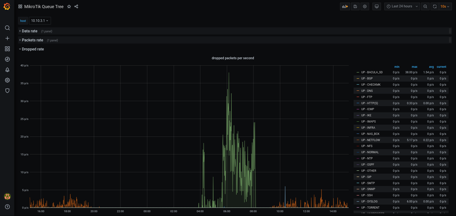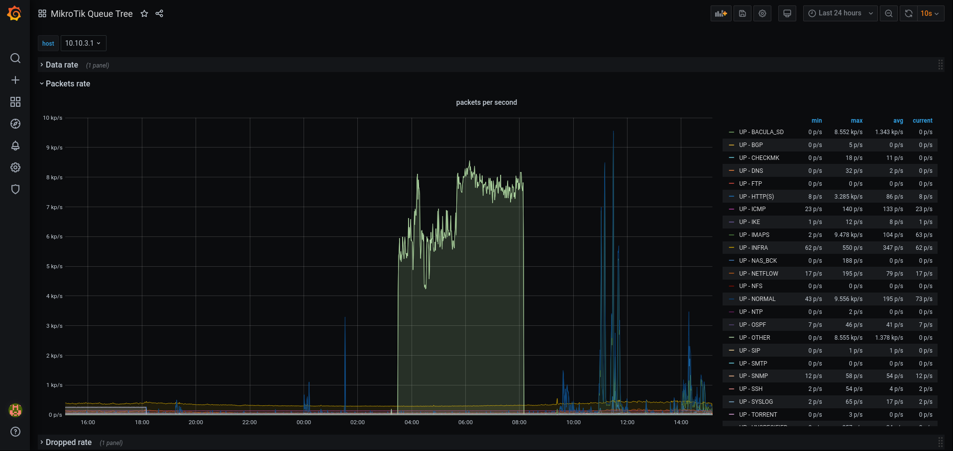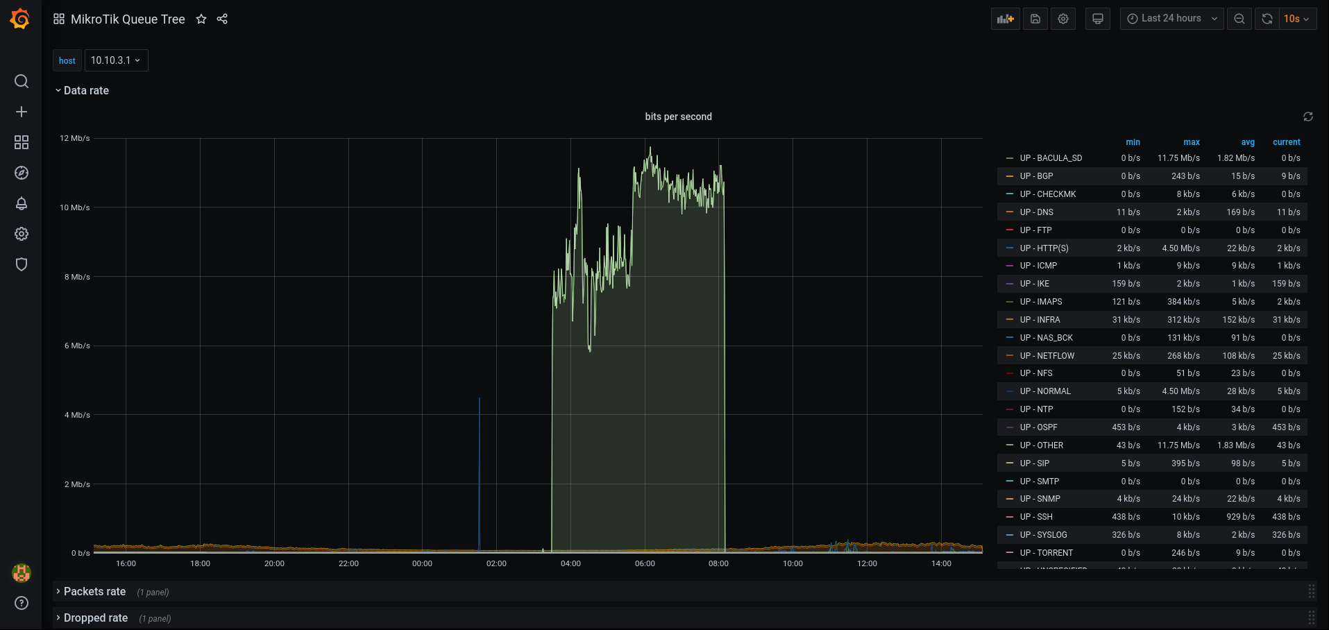 Visualise the Queue Tree of a MikroTik router. Data is collected using Telegraf's SNMP input plugin.