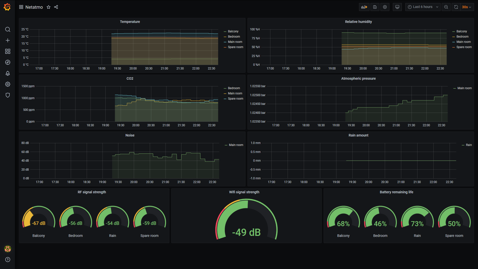 This dashboard is meant to be used with the Prometheus output from xperimental/netatmo-exporter https://github.com/xperimental/netatmo-exporter https://hub.docker.com/r/xperimental/netatmo-exporter