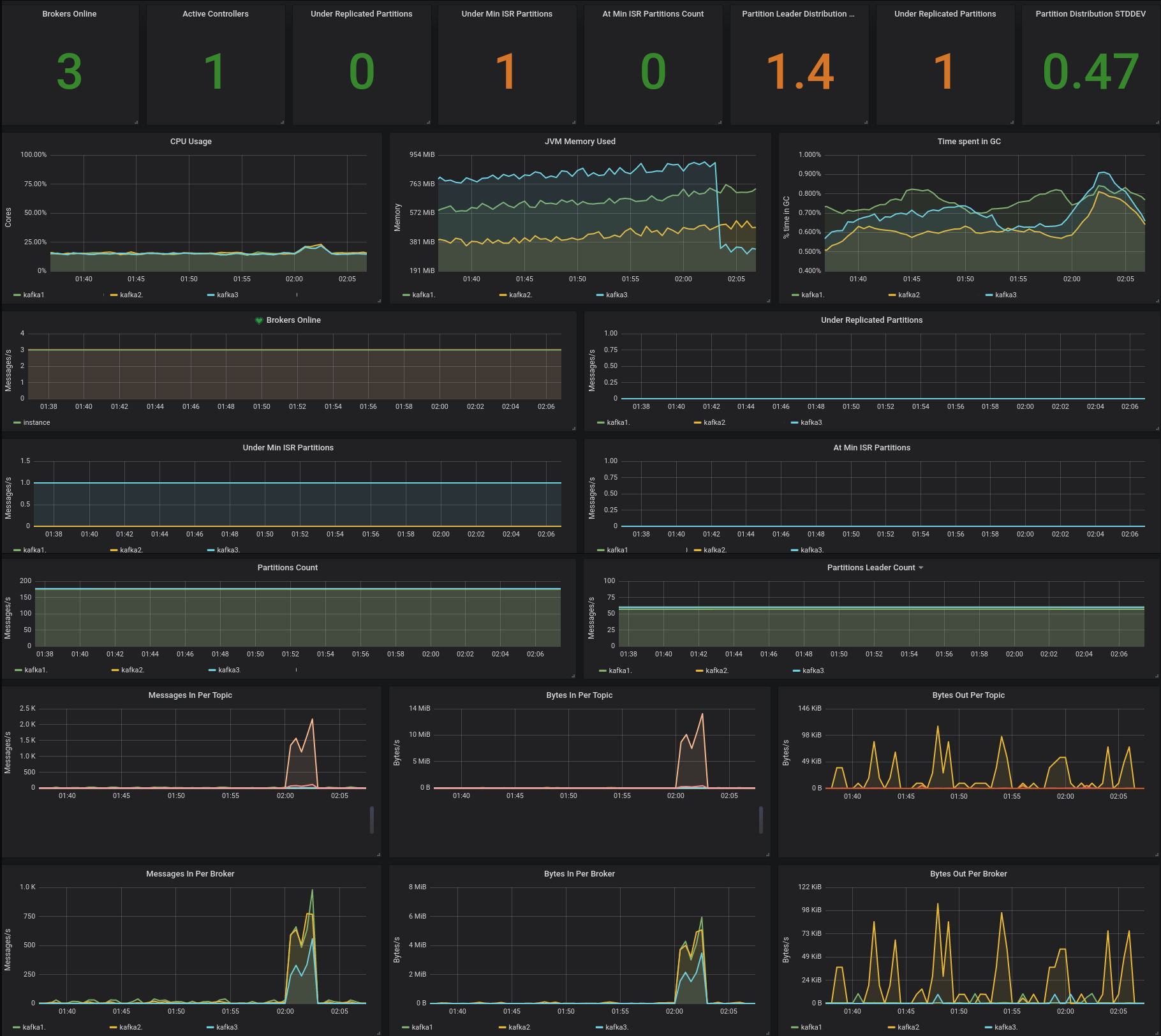 The Kafka Overview dashboard uses the prometheus data source to create a Grafana dashboard with the graph and singlestat panels.