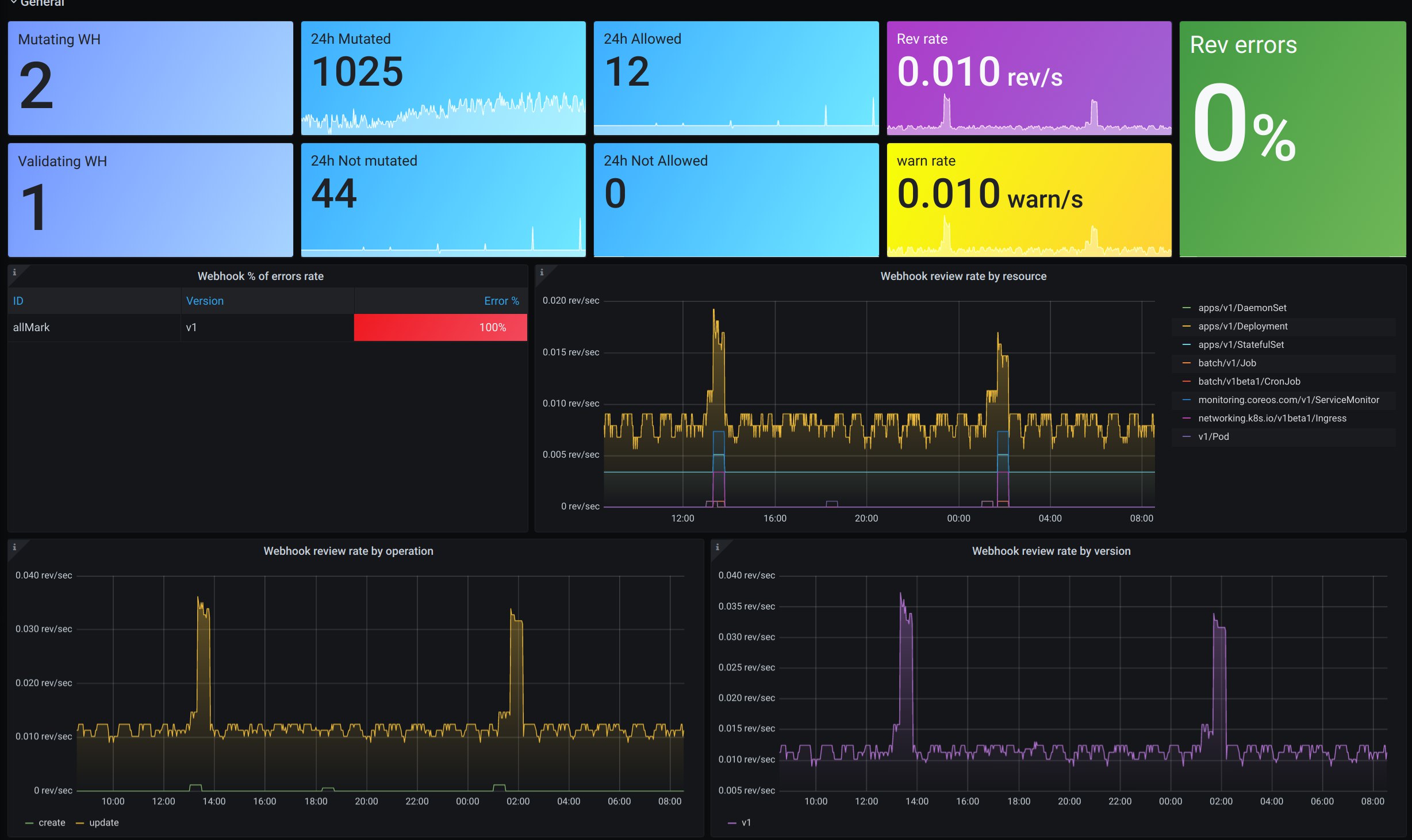 Uses Kubewebhook V2 metrics to create a general overview of all the Kubernetes admission webhooks running and also optional detailed overview per webhook.
