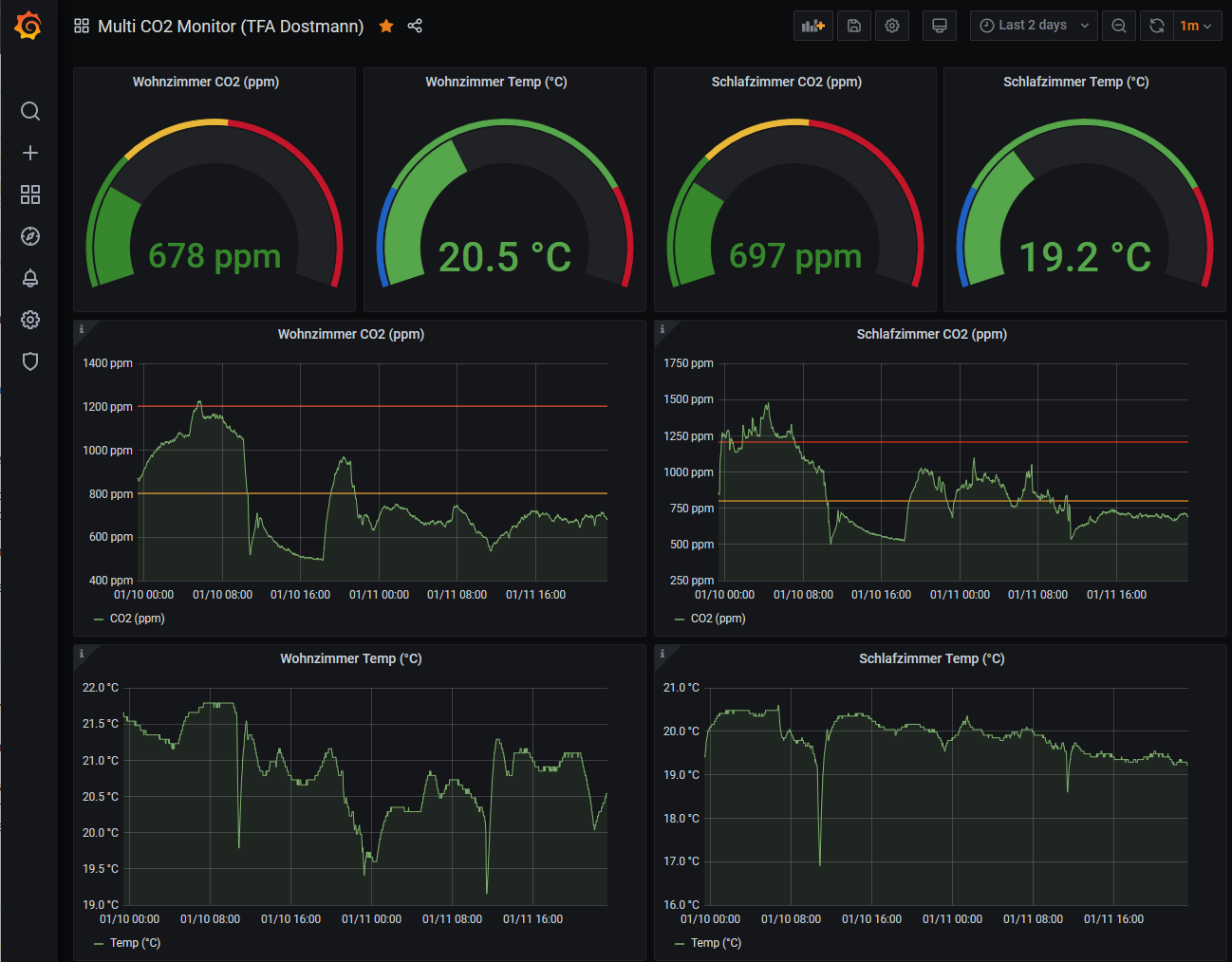 This dashboard shows CO² and temperatur statistics from two "AIRCO2NTROL MINI from TFA Dostmann".
