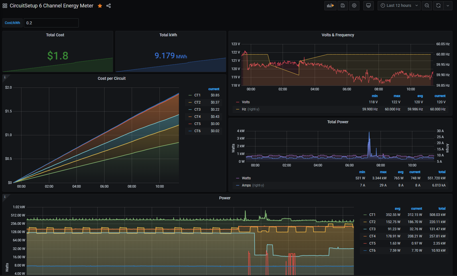Displays all 6 channels of the CircuitSetup.us 6 Channel Energy Meter, including calculations for cost per circuit, kWh, and power used per circuit. ESPHome is installed on the ESP32 that runs the meter, then stored in InfluxDB.