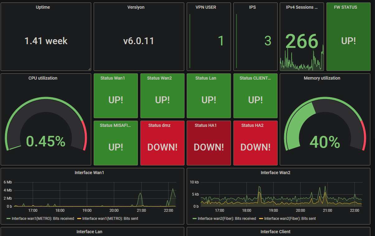 Hello It's me again.Once saw a Sophos Dashboard and tried to make something similiar to that.However,you need this URL: https://github.com/mbdraks/fortinet-zabbix to get proper items.And I strongly advise it.After that change variables and use it.