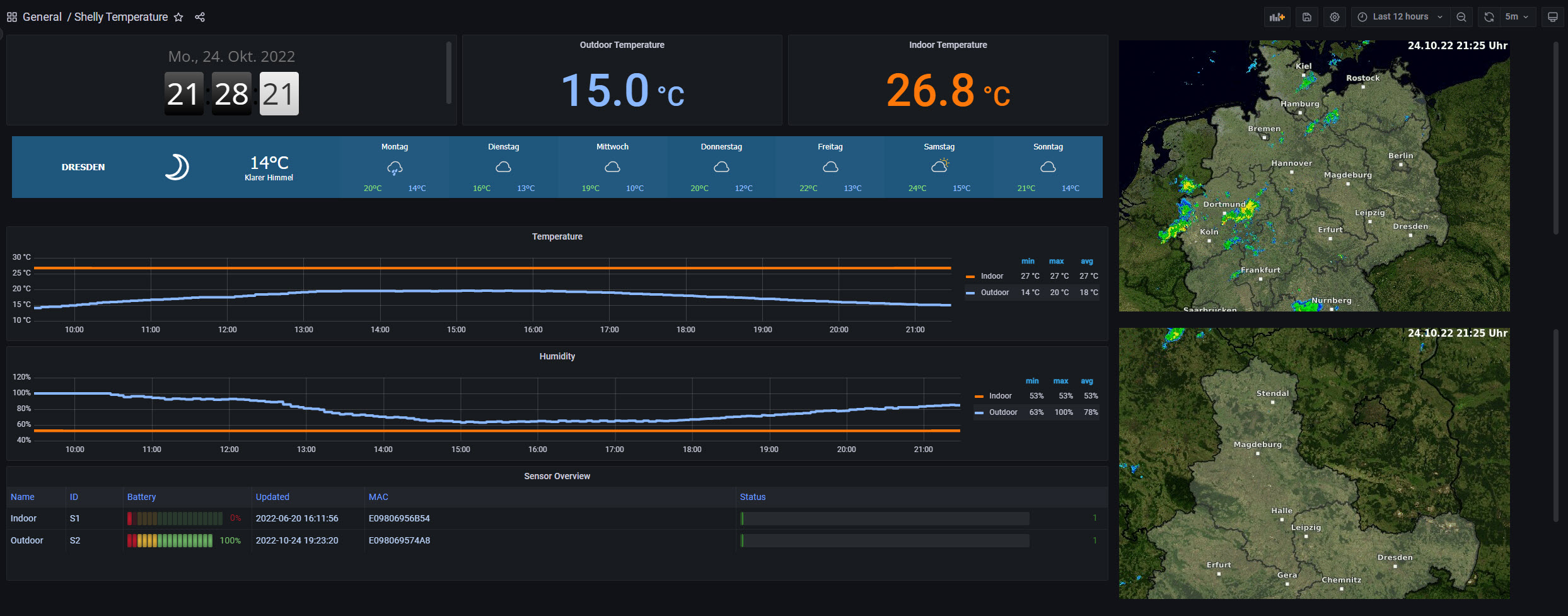 The Shelly Temperature dashboard uses the prometheus data source to create a Grafana dashboard with the grafana-clock-panel, stat, table, text and timeseries panels.