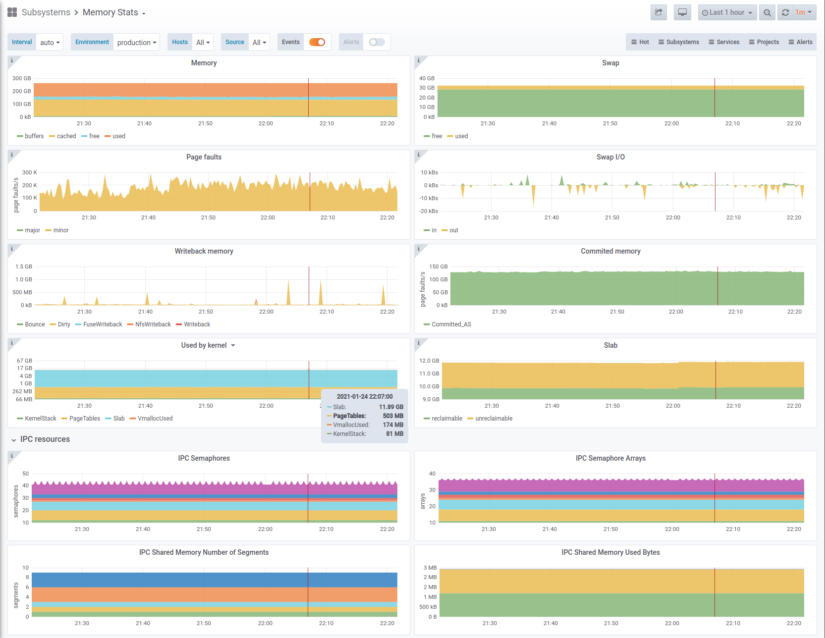 Detailed memory stats (used, free, cached, swap, slab, etc)