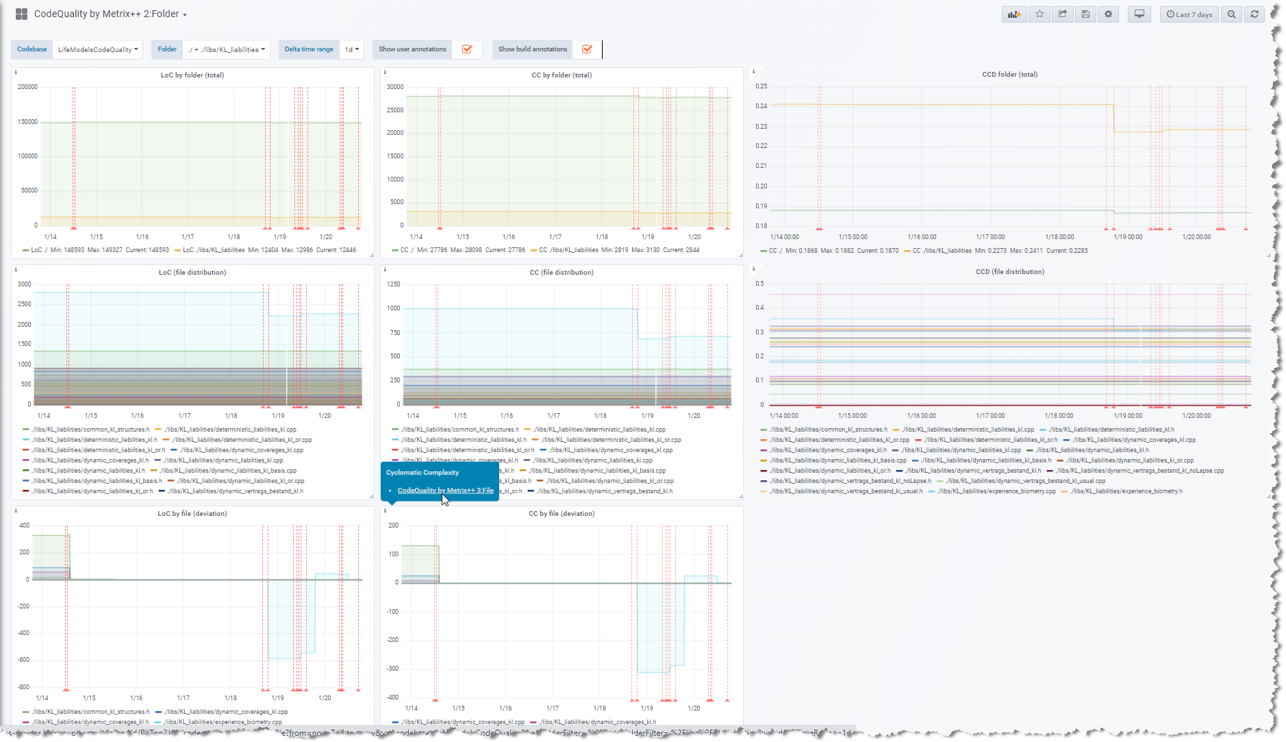 First it requires you to put Metrix++ in place for your codebase (C/C++, C# and Java), (see also its github repo), and to setup a Prometheus instance scraping the output of the following commands: