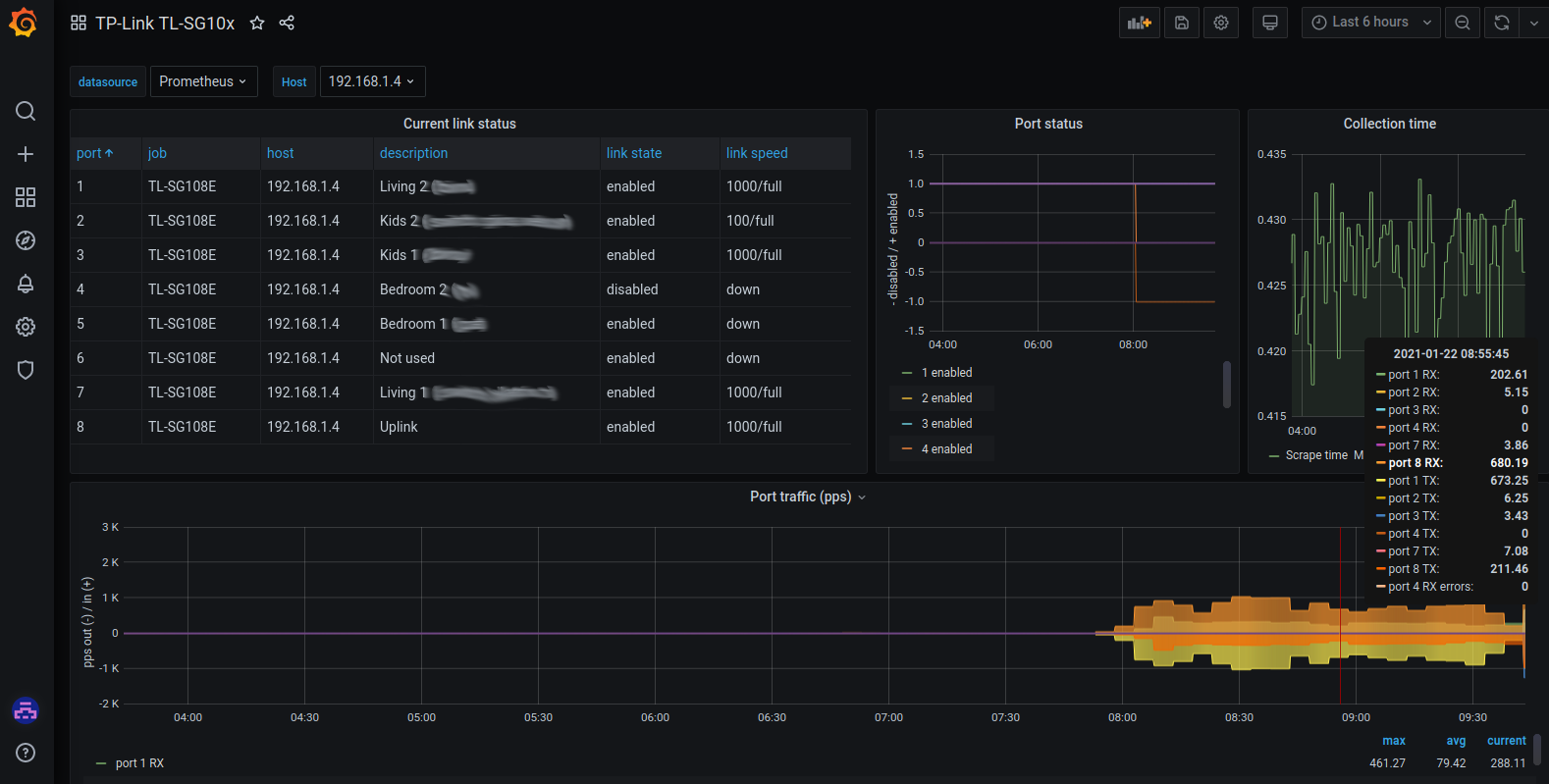 Dashboard to view port status and pps for TPLink TL-SG10x switches (e.g. TL-SG108E) collected via Prometheus with https://github.com/mad-ady/tl-sg-prometheus-exporter