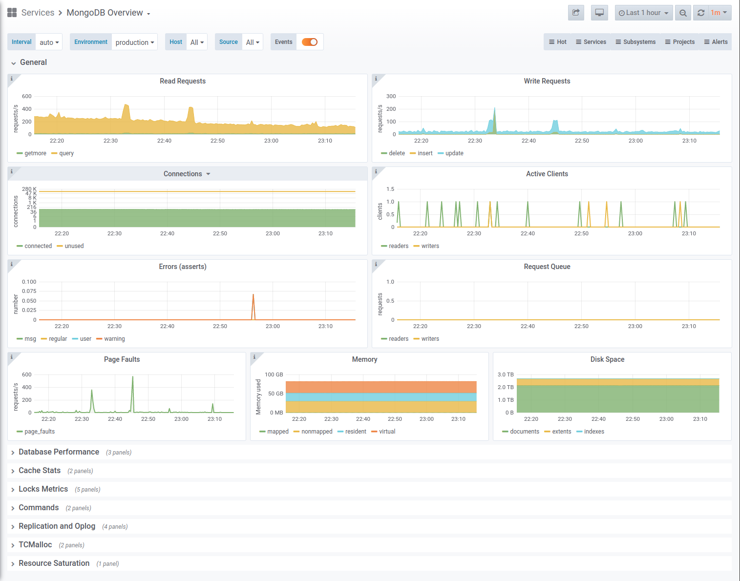 - ReplicaSet metrics (members, oplog, heartbeat)