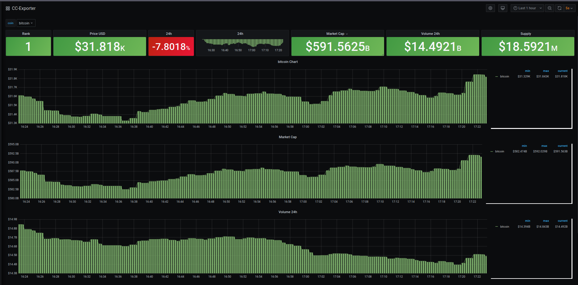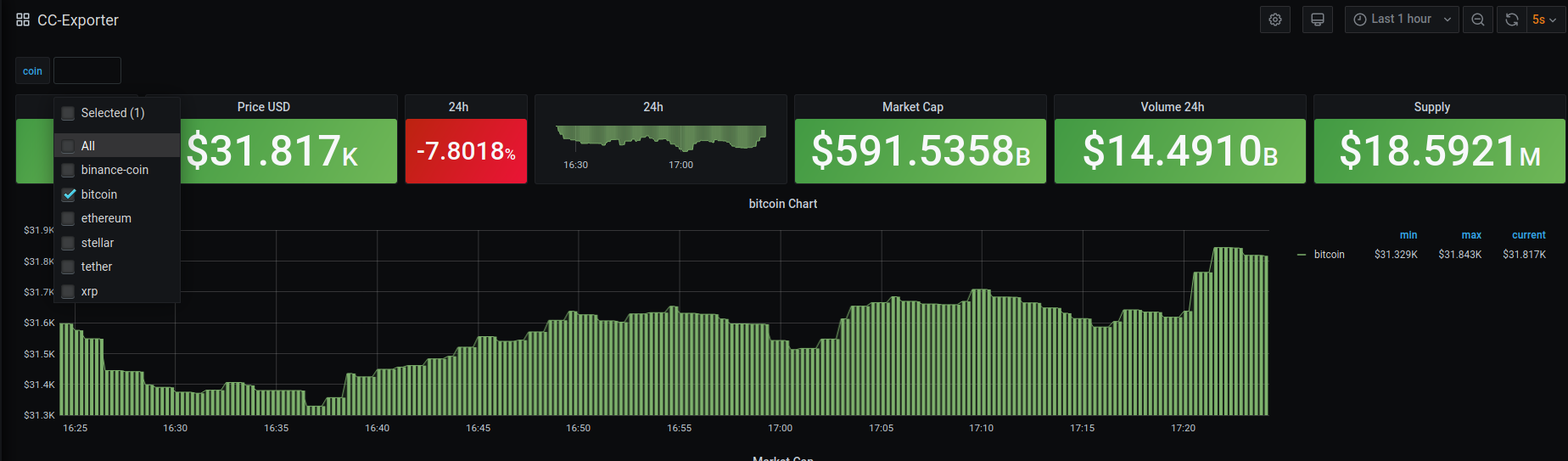 CC-Exporter is a Prometheus metrics exporter developed with Python which allows you to monitor Cryptocurrencies Market Cap from Grafana dashboards and define multiple alerts by generating metrics from CoinCap public api.