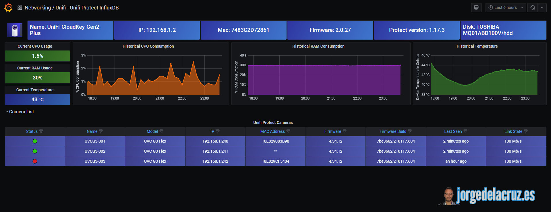 This project consists in a Bash Shell script to retrieve the Unifi Protect information, directly from the API, about cameras, firmware, versions, CPU and RAM from the Protect Host, and much more. The information is being saved it into InfluxDB output directly into the InfluxDB database using curl, then in Grafana: a Dashboard is created to present all the information.