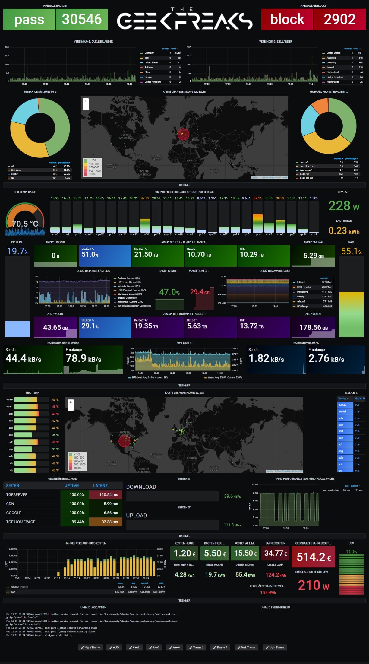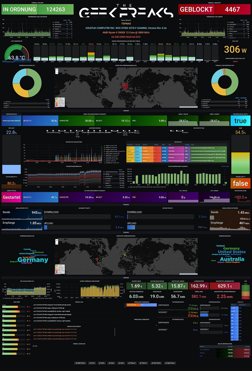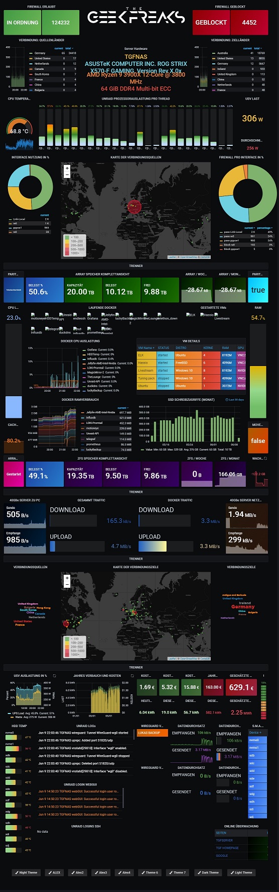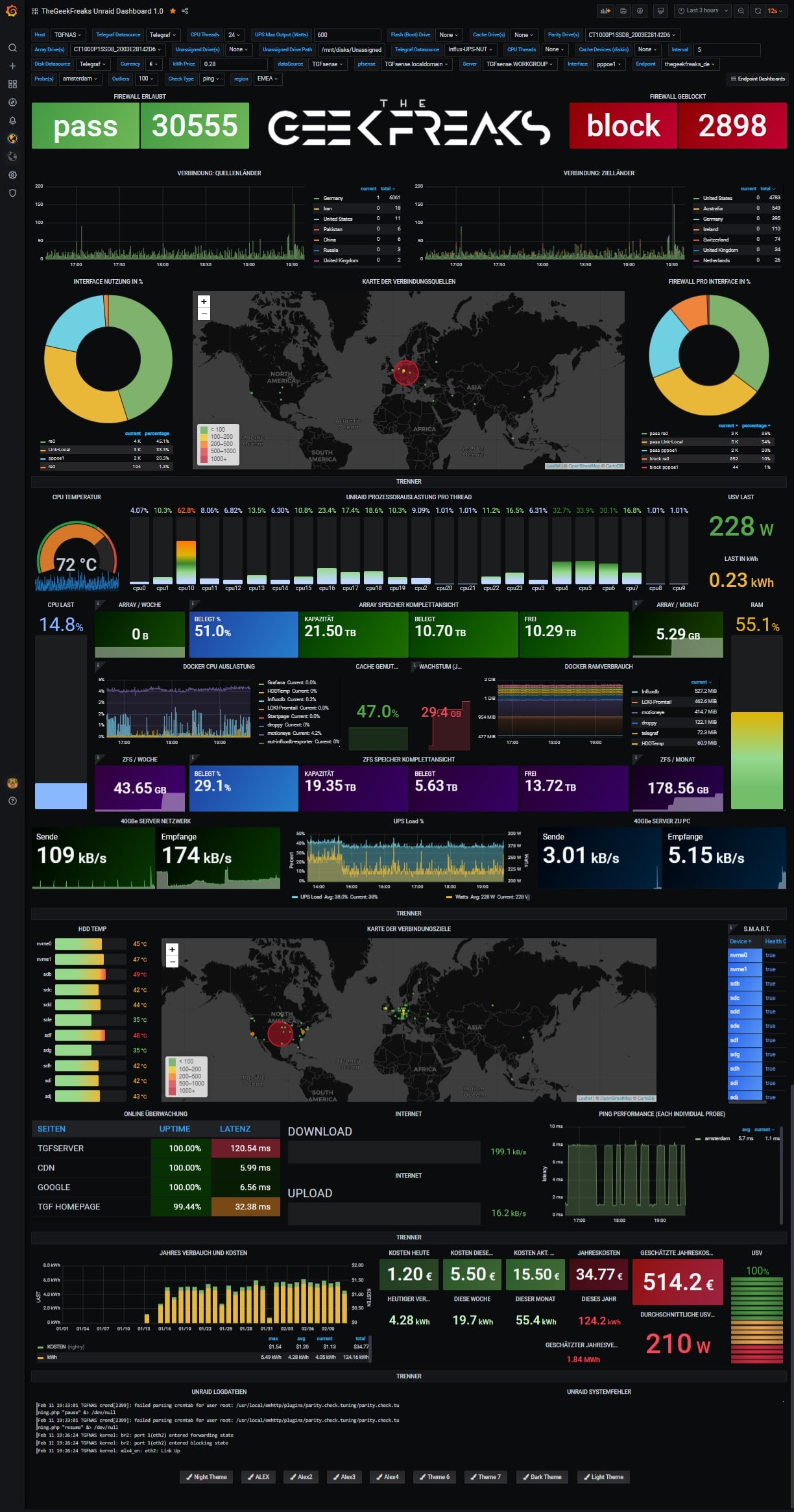 The TheGeekFreaks Unraid Dashboard 1.6 dashboard uses the elasticsearch, graphite, influxdb, loki, marcusolsson-json-datasource and prometheus data sources to create a Grafana dashboard with the bargauge, dalvany-image-panel, grafana-piechart-panel, grafana-worldmap-panel, graph, magnesium-wordcloud-panel, mxswat-separator-panel, singlestat, stat, table, text and yesoreyeram-boomtheme-panel panels.