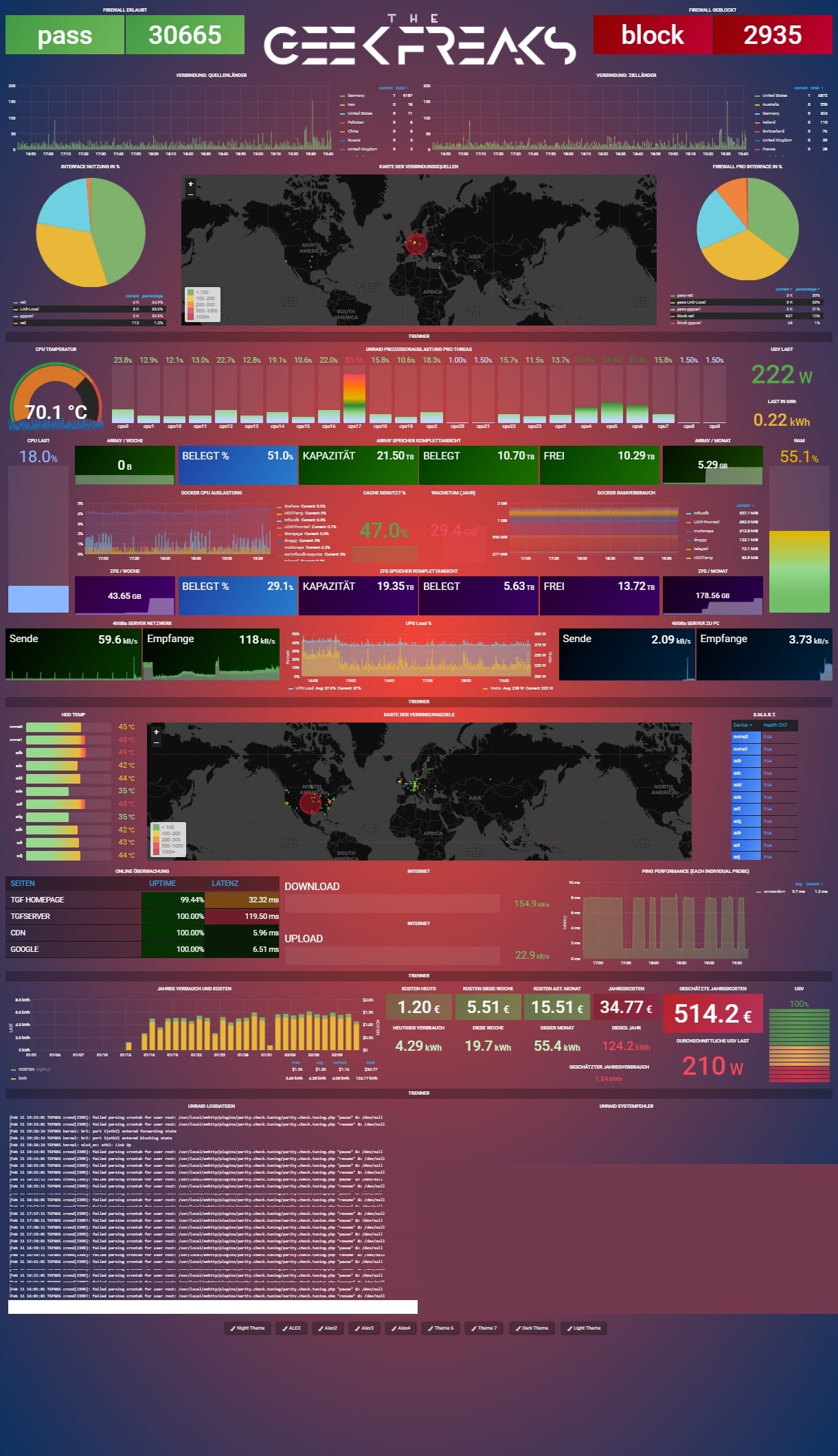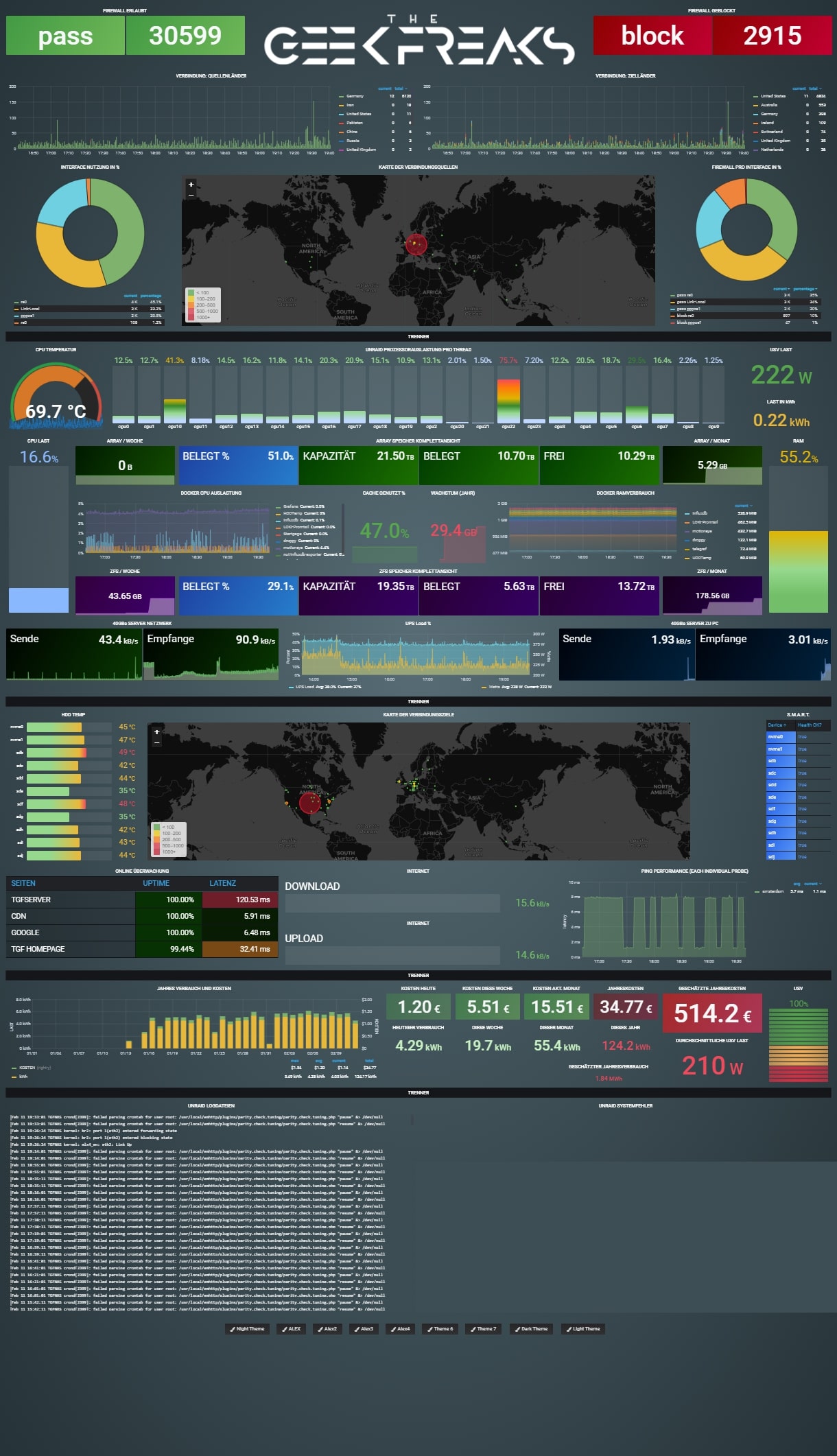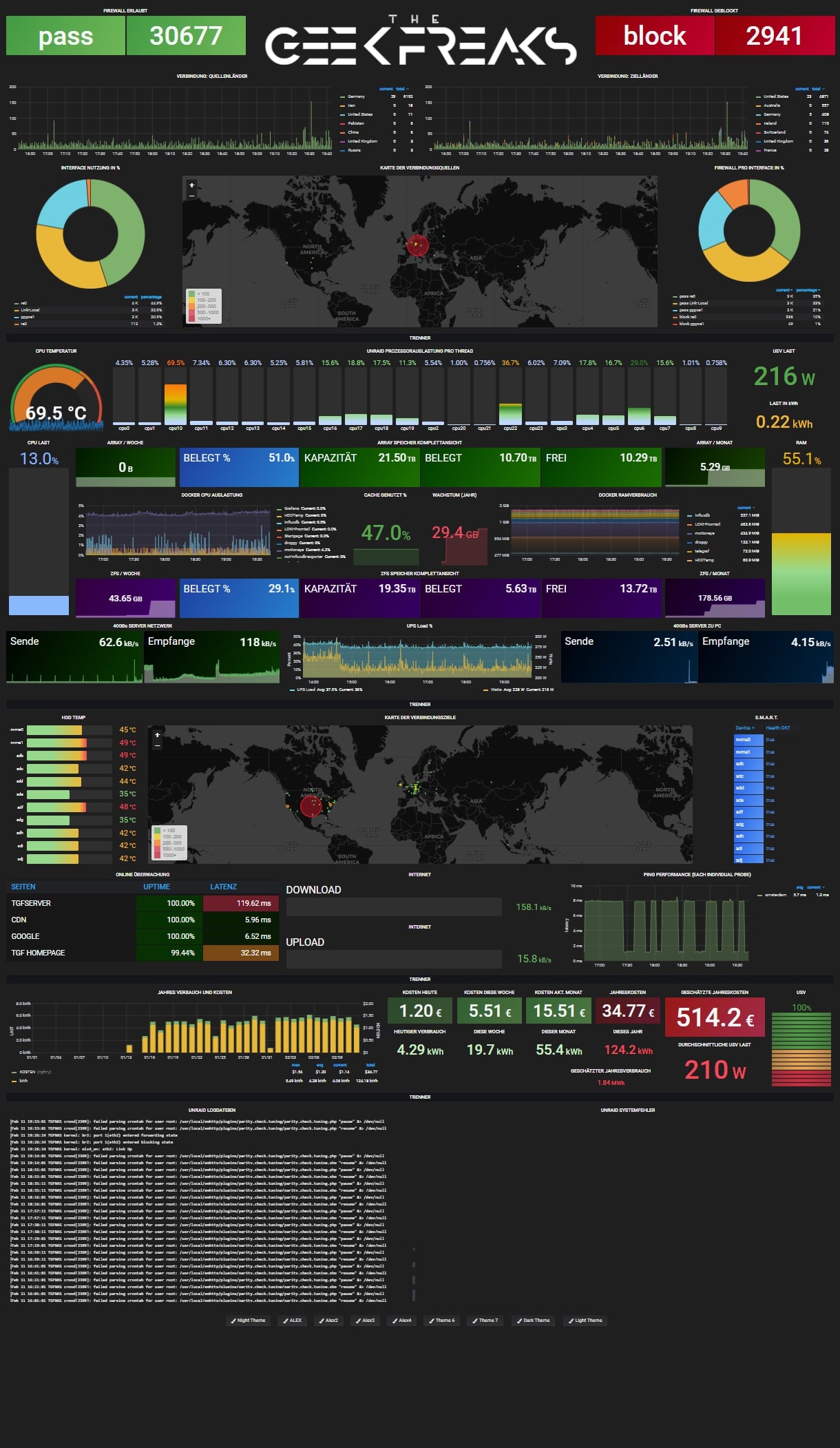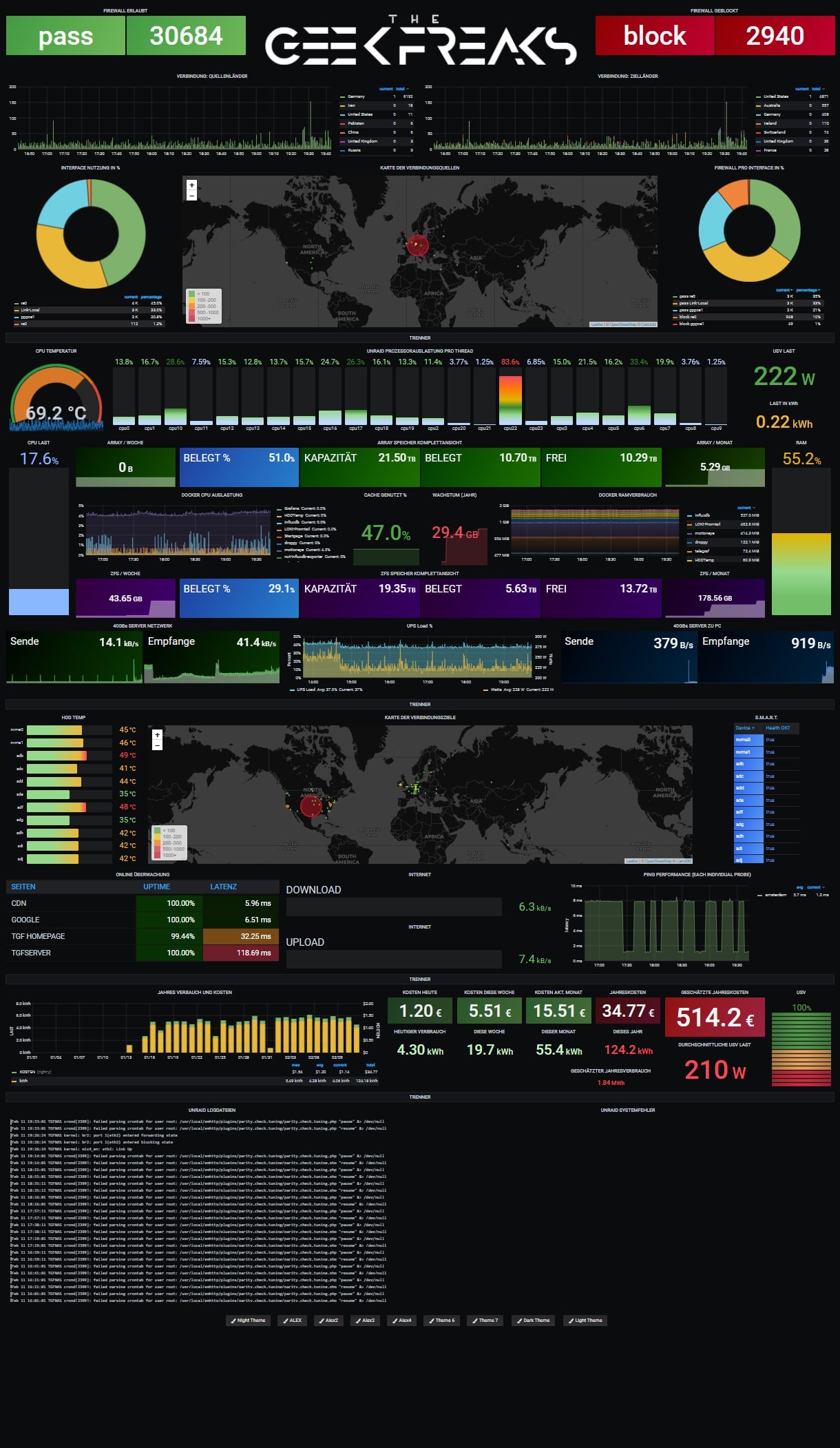 The TheGeekFreaks Unraid Dashboard 1.6 dashboard uses the elasticsearch, graphite, influxdb, loki, marcusolsson-json-datasource and prometheus data sources to create a Grafana dashboard with the bargauge, dalvany-image-panel, grafana-piechart-panel, grafana-worldmap-panel, graph, magnesium-wordcloud-panel, mxswat-separator-panel, singlestat, stat, table, text and yesoreyeram-boomtheme-panel panels.