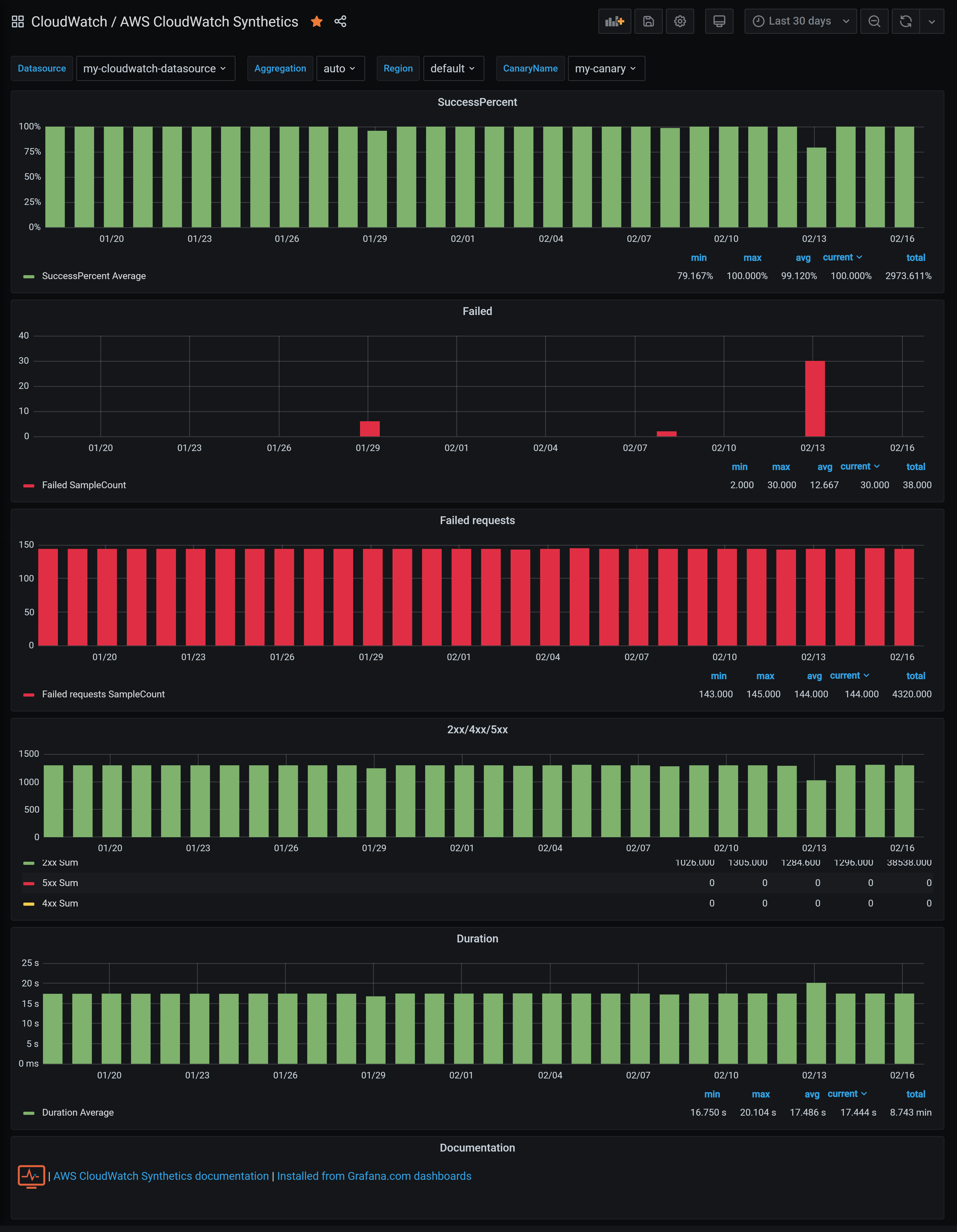 Visualize AWS CloudWatch Synthetics metrics.