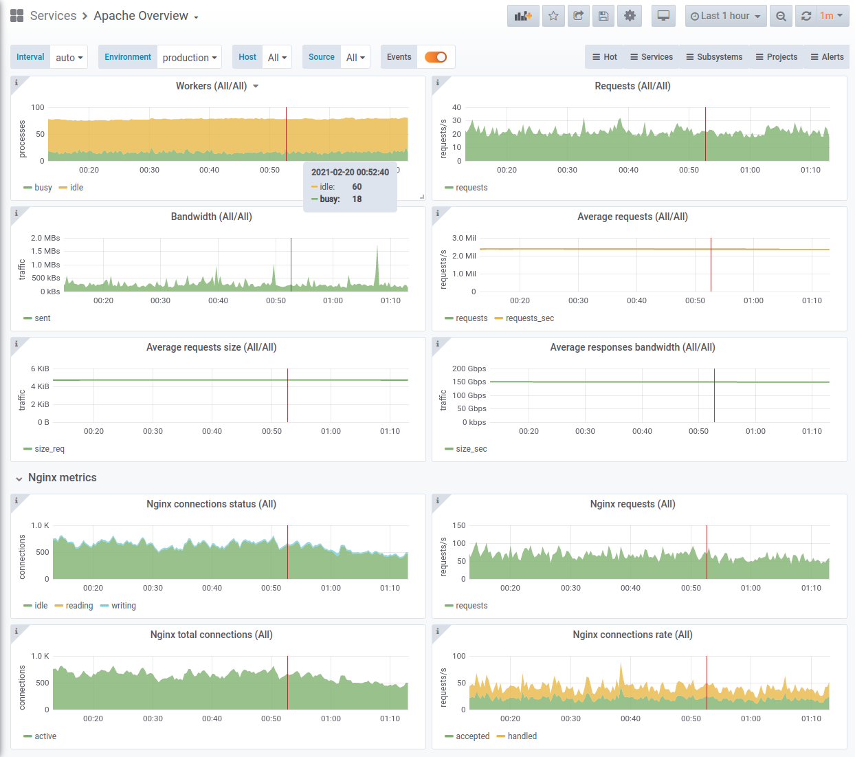A dashboard with an overview for Apache metrics: