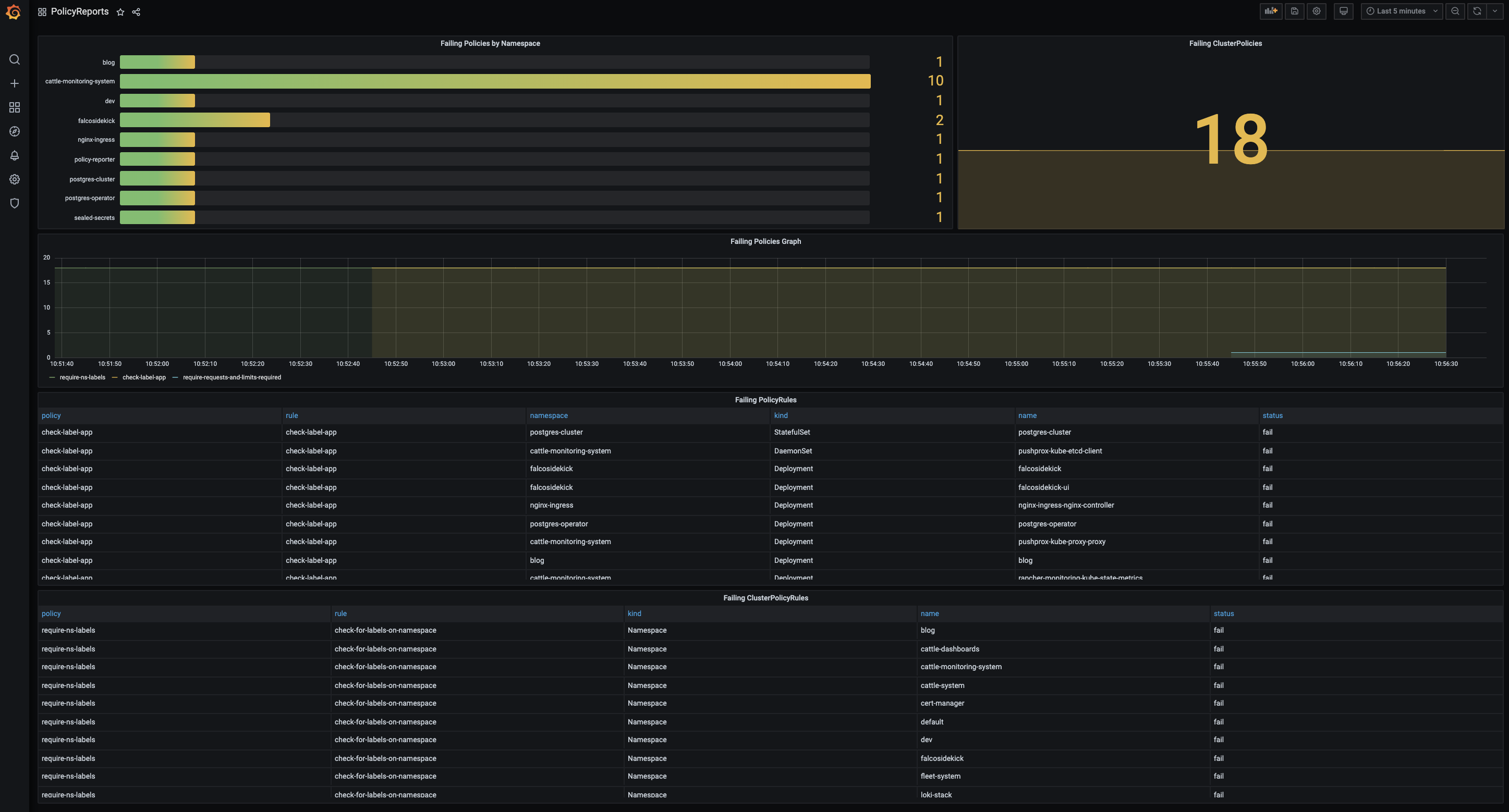 Collect failed Results from PolicyReports and ClusterPolicyResults as Graphs and Tables. Metrics provided from https://github.com/fjogeleit/policy-reporter