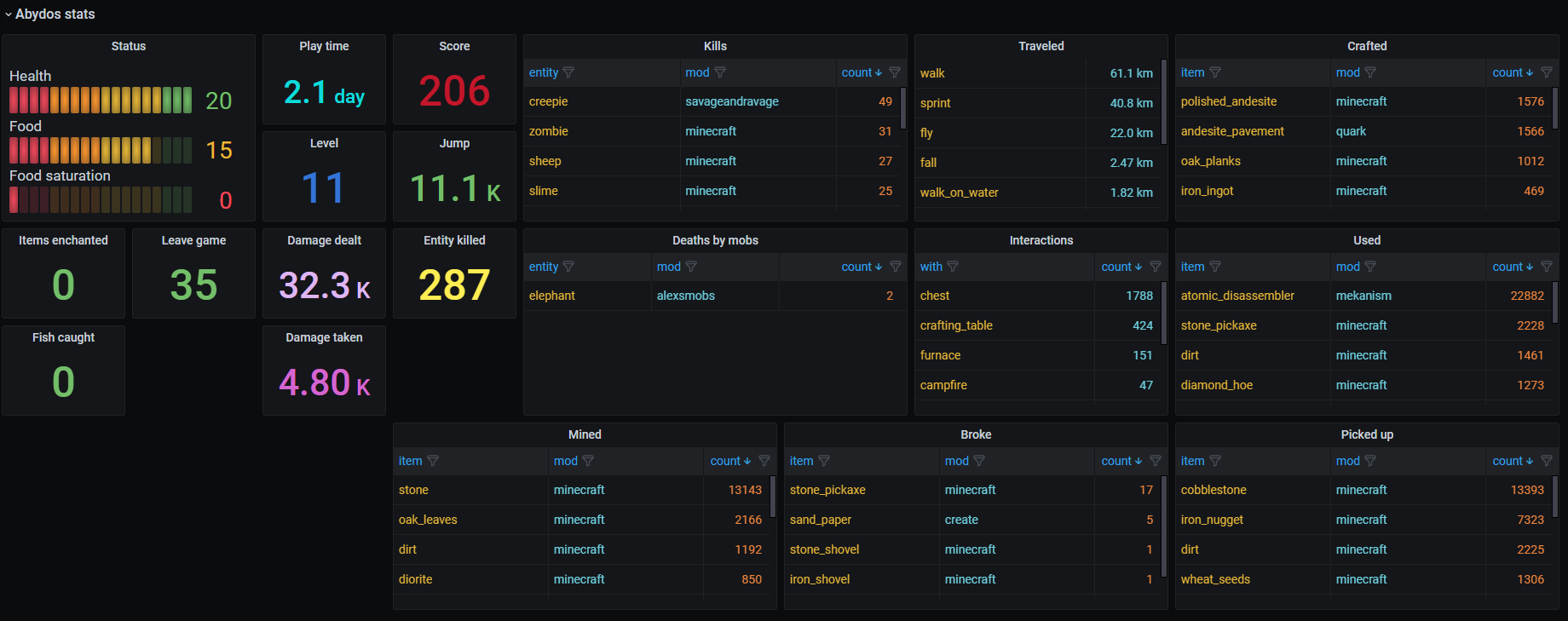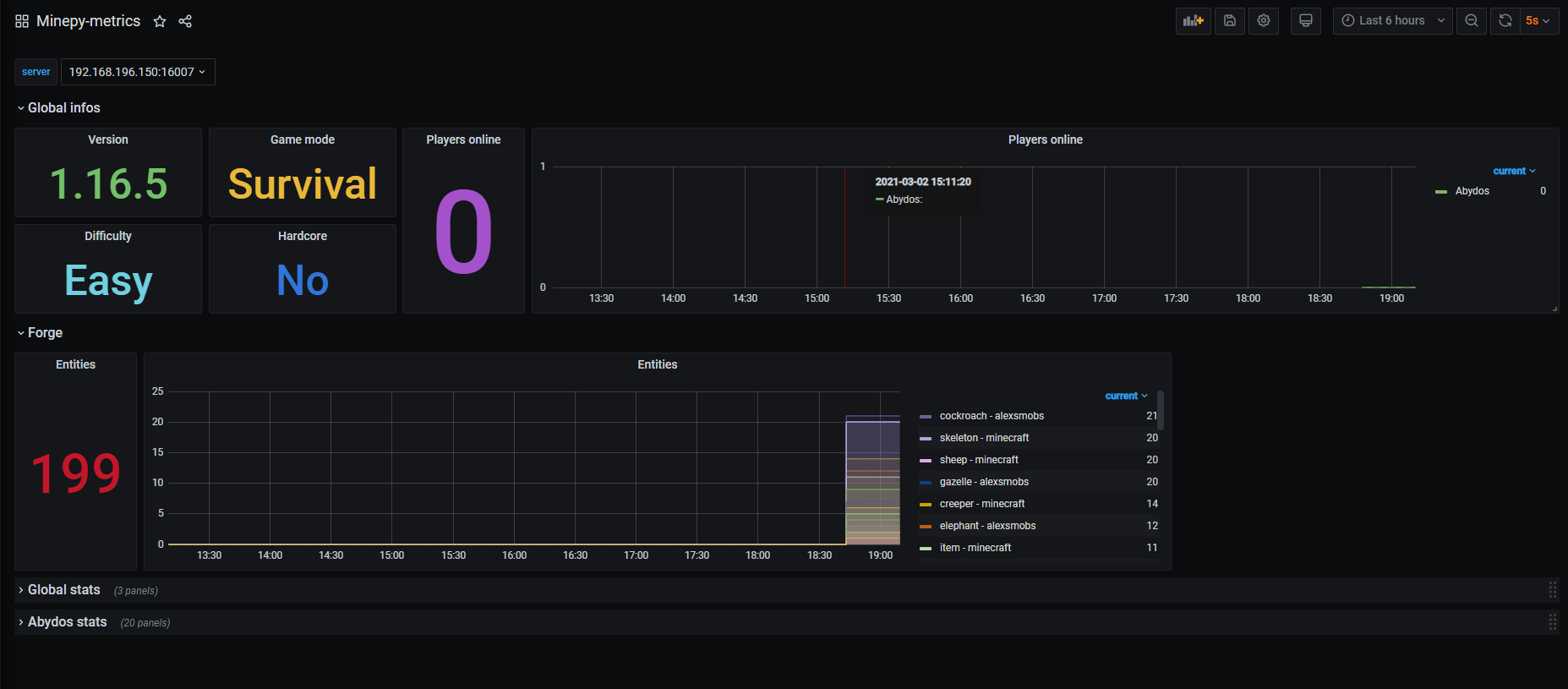 The Minepy-metrics dashboard uses the prometheus data source to create a Grafana dashboard with the bargauge, graph, stat and table panels.
