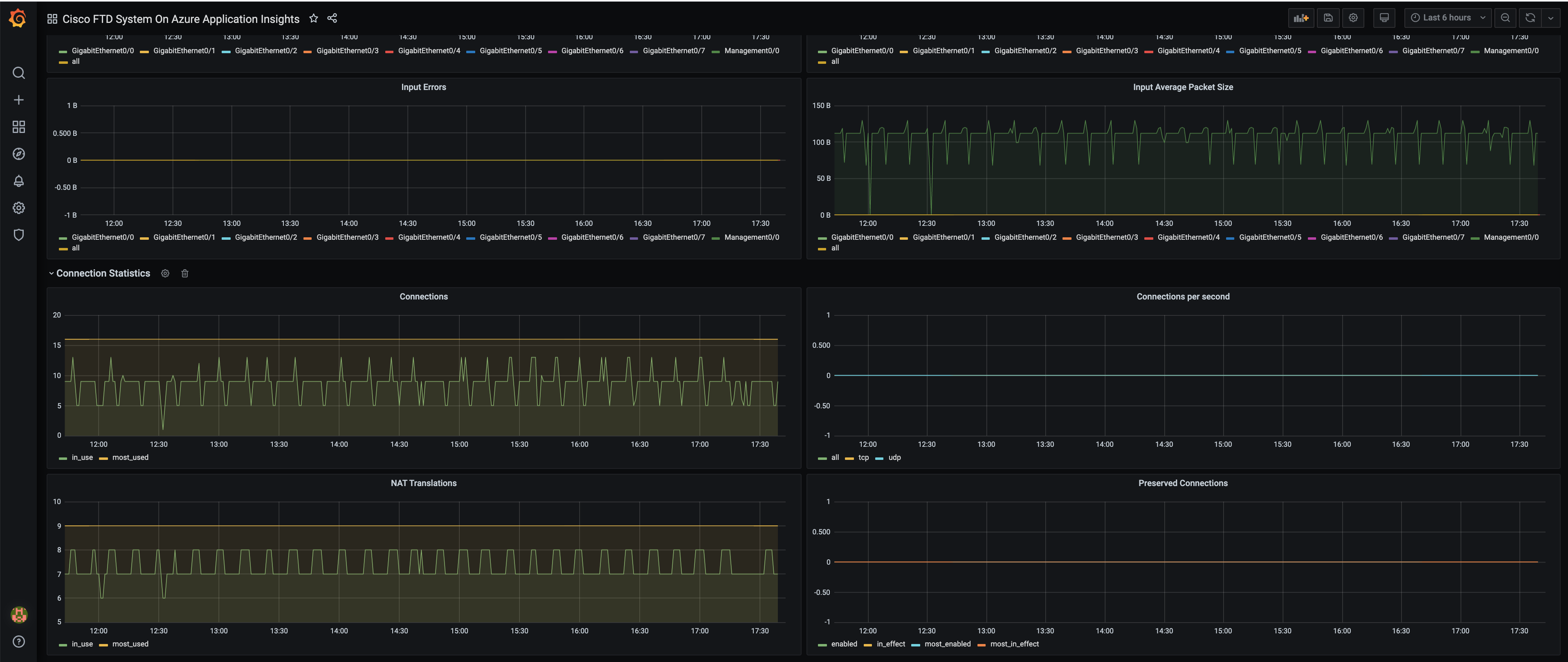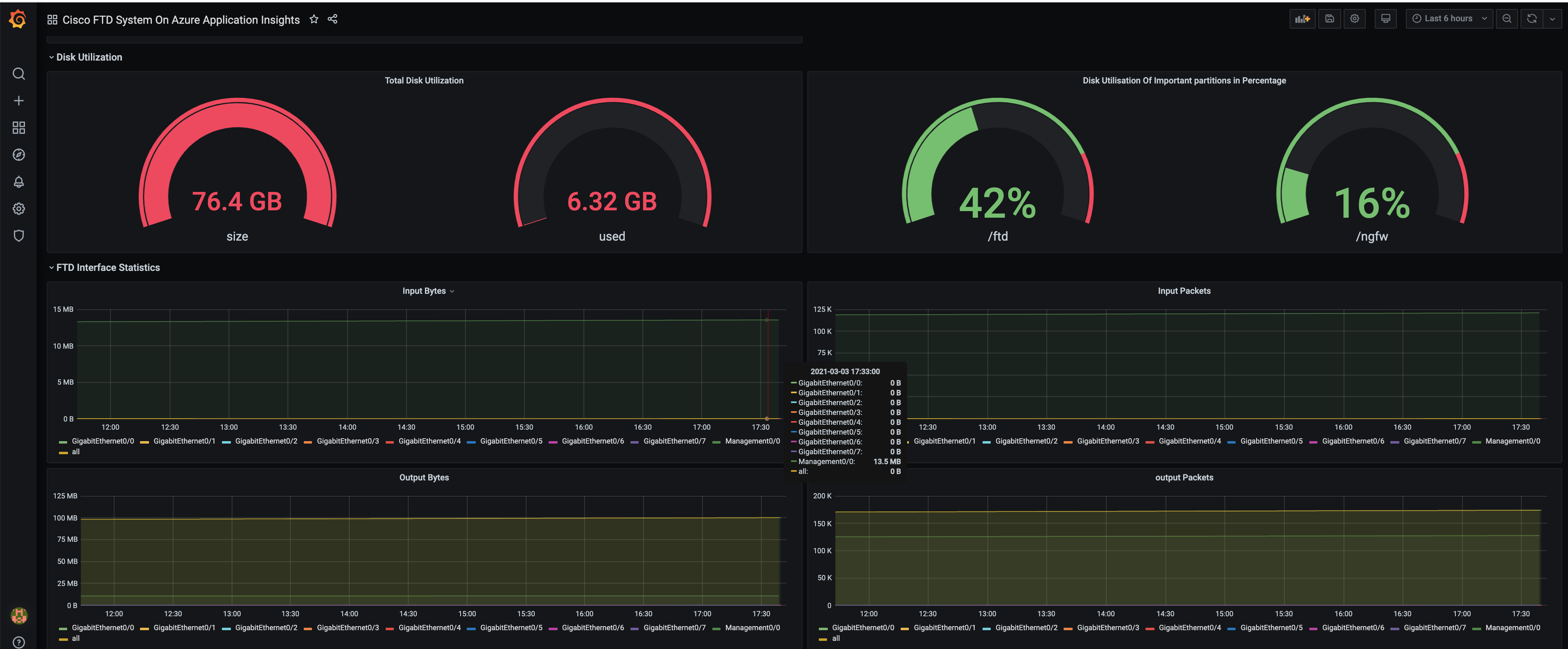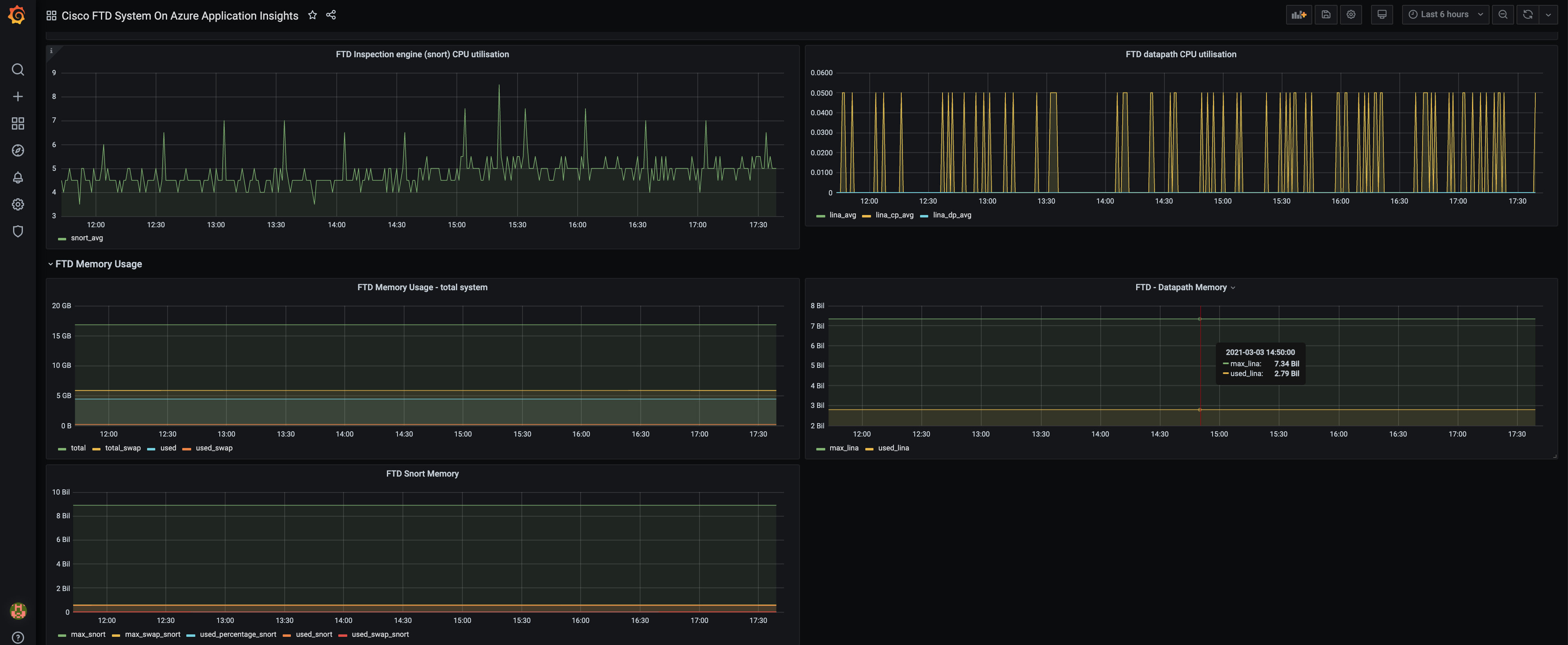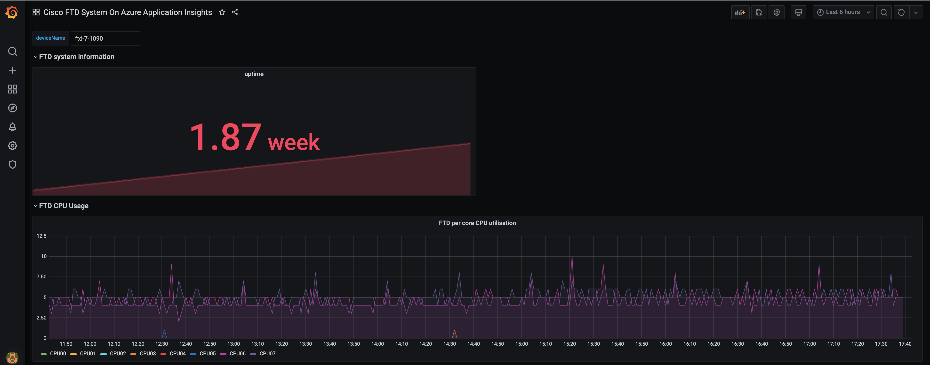 Cisco Firepower Threat Defence device can be configured to emit metrics to Azure Application Insights. This feature will be available to Cisco FTD customers in second half of calendar year 2021. The customers can monitor these metrics on this grafana dashboard by pointing the grafana dashboard to Azure Application Insight instance. To do that: