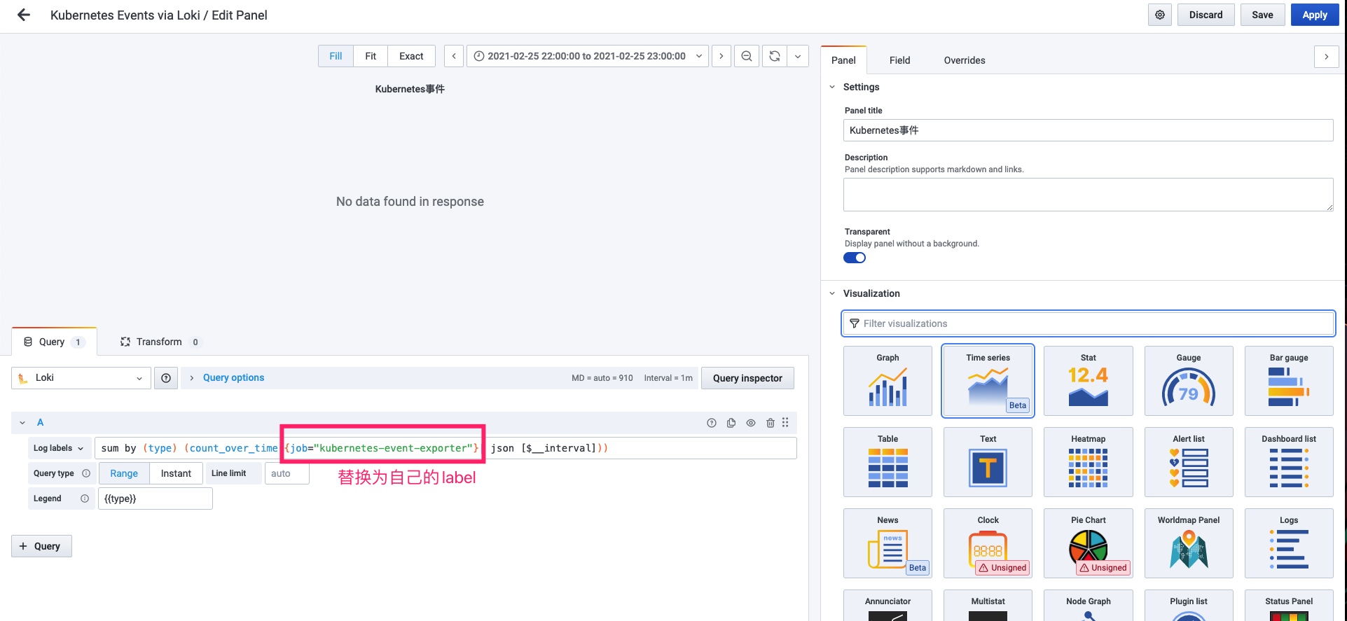 {job="kubernetes-event-exporter"} 替换成自己的label