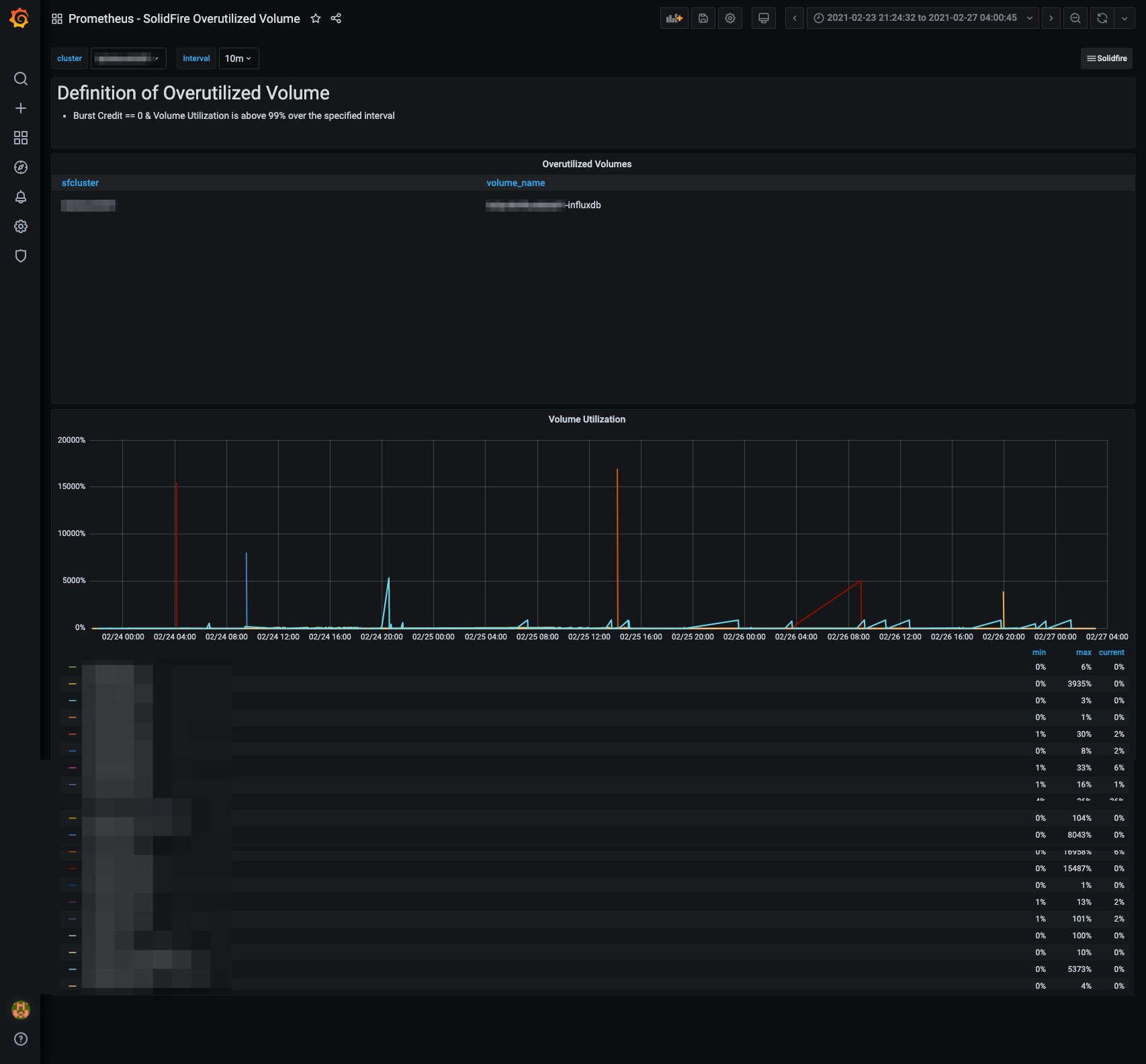 NetApp SolidFire Overutilized Volume powered by https://github.com/mjavier2k/solidfire-exporter