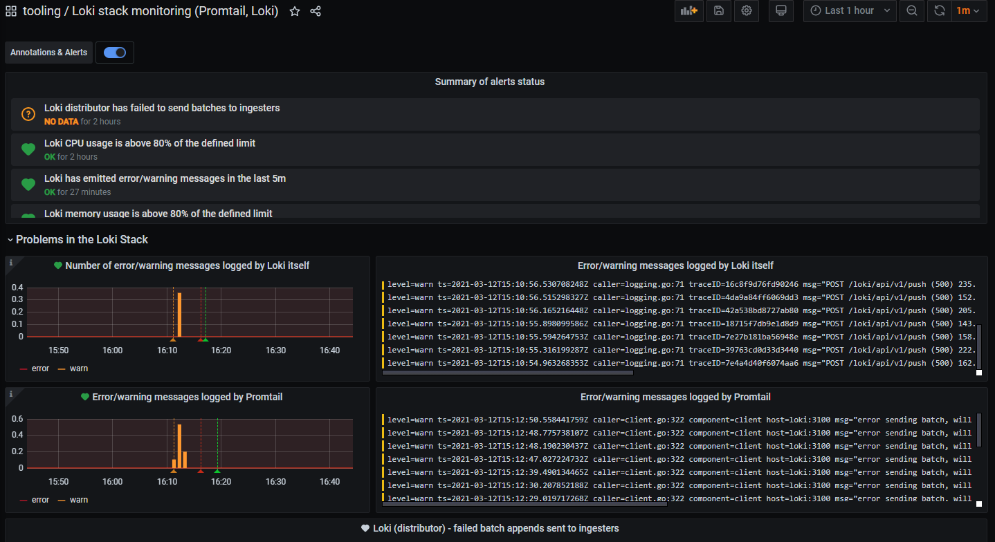 This dashboard can be used to detect issues on the Loki stack, when deployed in Kubernetes. Shows: some error metrics published by Promtail/Loki. Error and warning logs emitted by Promtail/Loki. Memory and CPU usage of Promtail/Loki compared against the Kubernetes memory/cpu limits and requests.