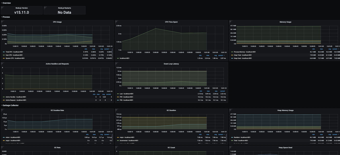To use this dashboard, please follow the Node.js Exporter Quickstart. This quickstart helps you monitor your Node.js server by setting up prom-client for Node.js with preconfigured dashboards, alerting rules, and recording rules. This dashboard includes panels for the following metrics: