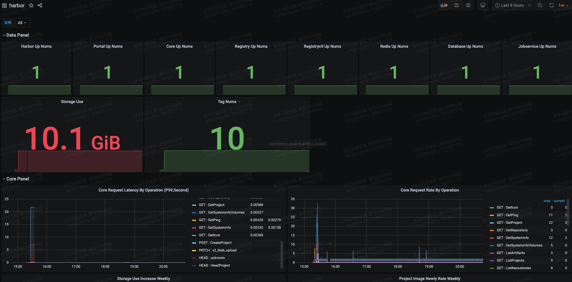 The harbor dashboard uses the prometheus data source to create a Grafana dashboard with the graph and stat panels.