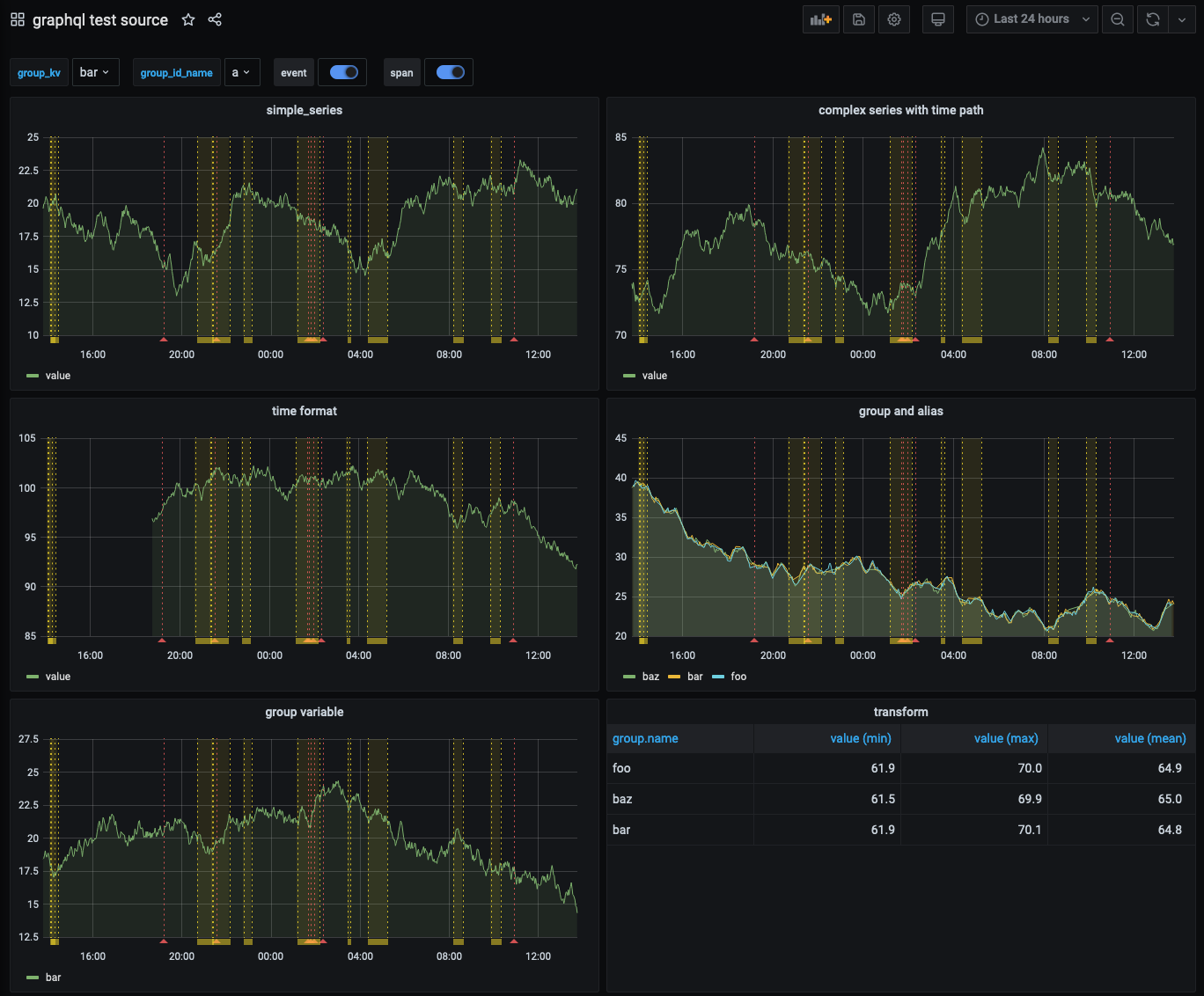 This is a sample dashboard demonstrating the features of the GraphQL datasource plugin. It uses the FIFEmon GraphQL test source server