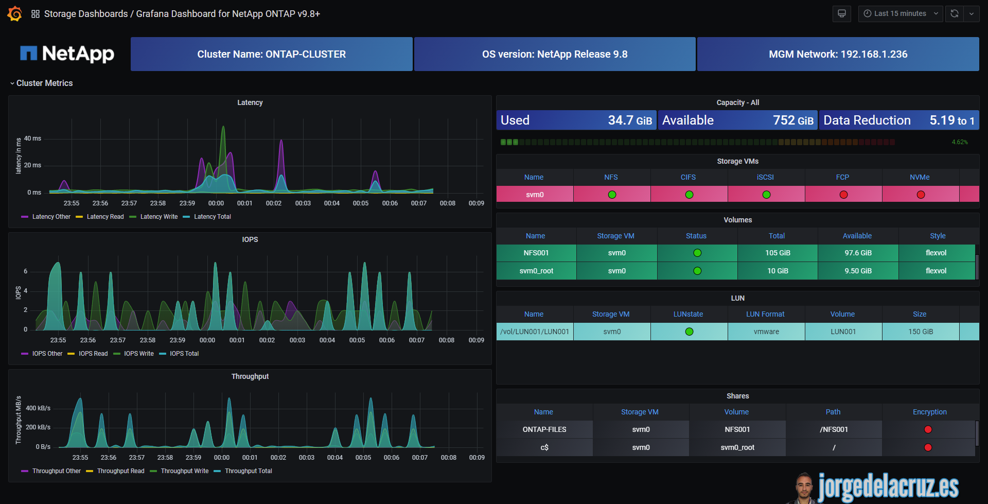 netappUsername="YOURONTAPUSER" #Your username with privileges to login into the ONTAP netappPassword='YOURONTAPPASSWORD' netappAuth=$(echo -ne "$netappUsername:$netappPassword" | base64); netappRestServer="YOURONTAPSERVER" netappMetrics="20" #They came in interval of 15 seconds, so 20 will be equal to the metrics of the last 5 minutes. If you want to run your script every 5 minutes, let it like this, if not, change it accordingly.