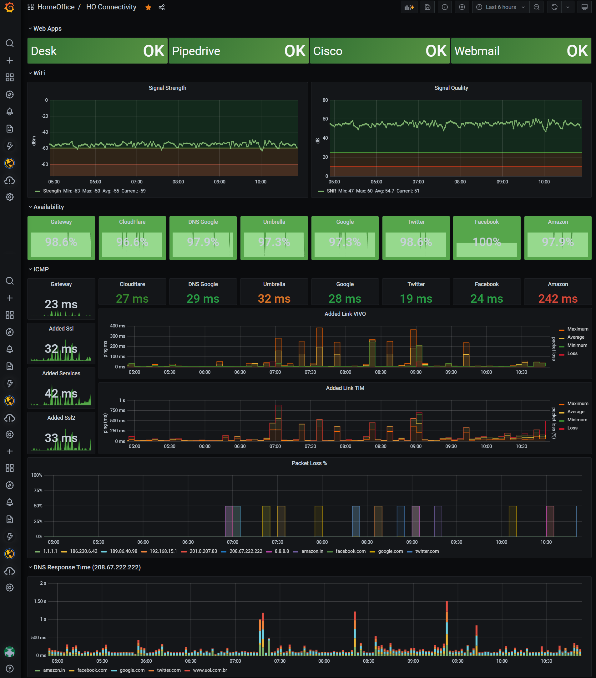 Dashboard for HomeOffice Monitoring. Using Telegraf (ping, dns, http_responde and wireless plugins) + Prometheus we can see the http response code, icmp response time and packet loss, dns response time and wifi status.