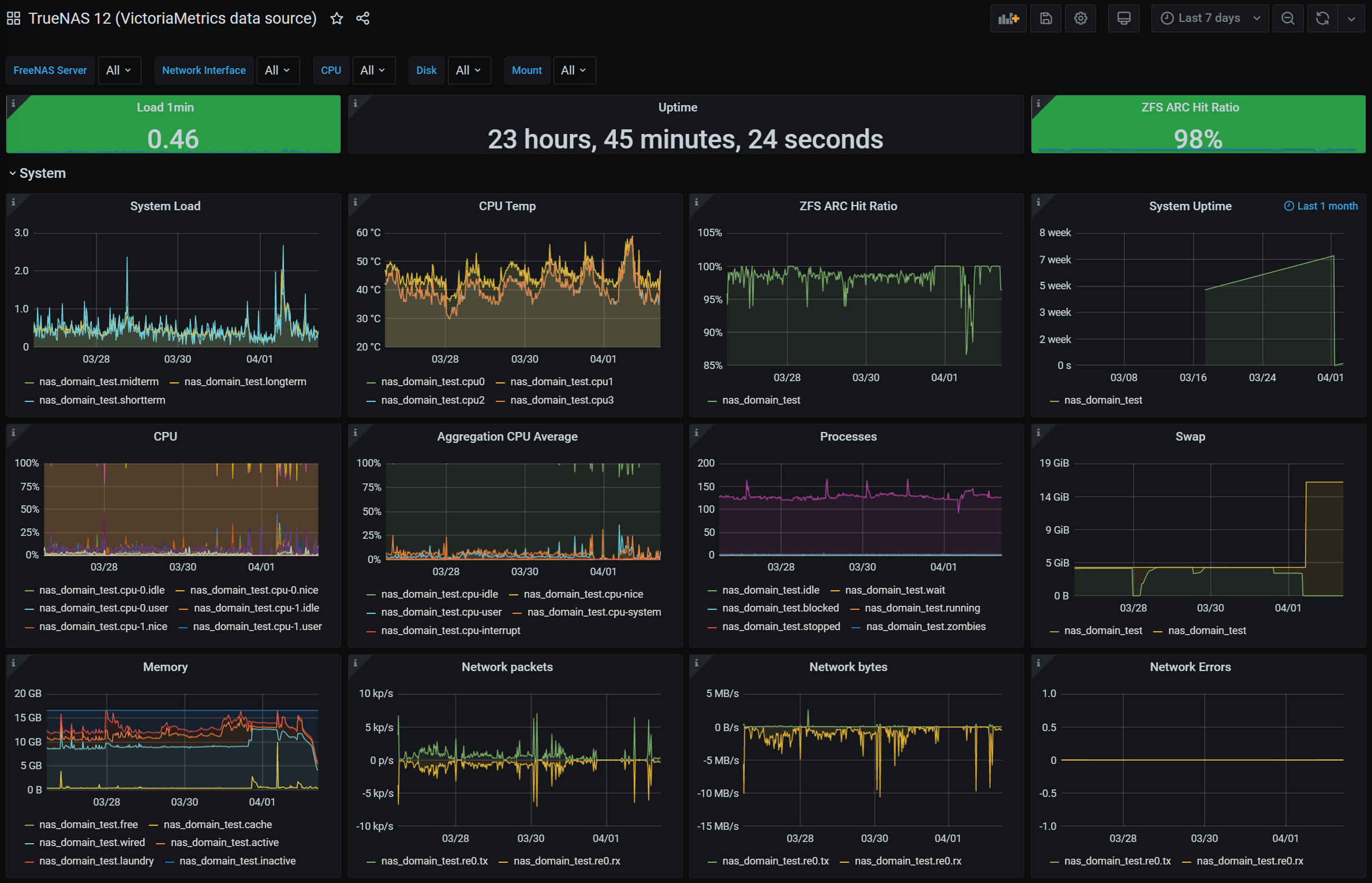 TrueNAS 12 dashboard using official Graphite export to a Victoria Metrics data source.