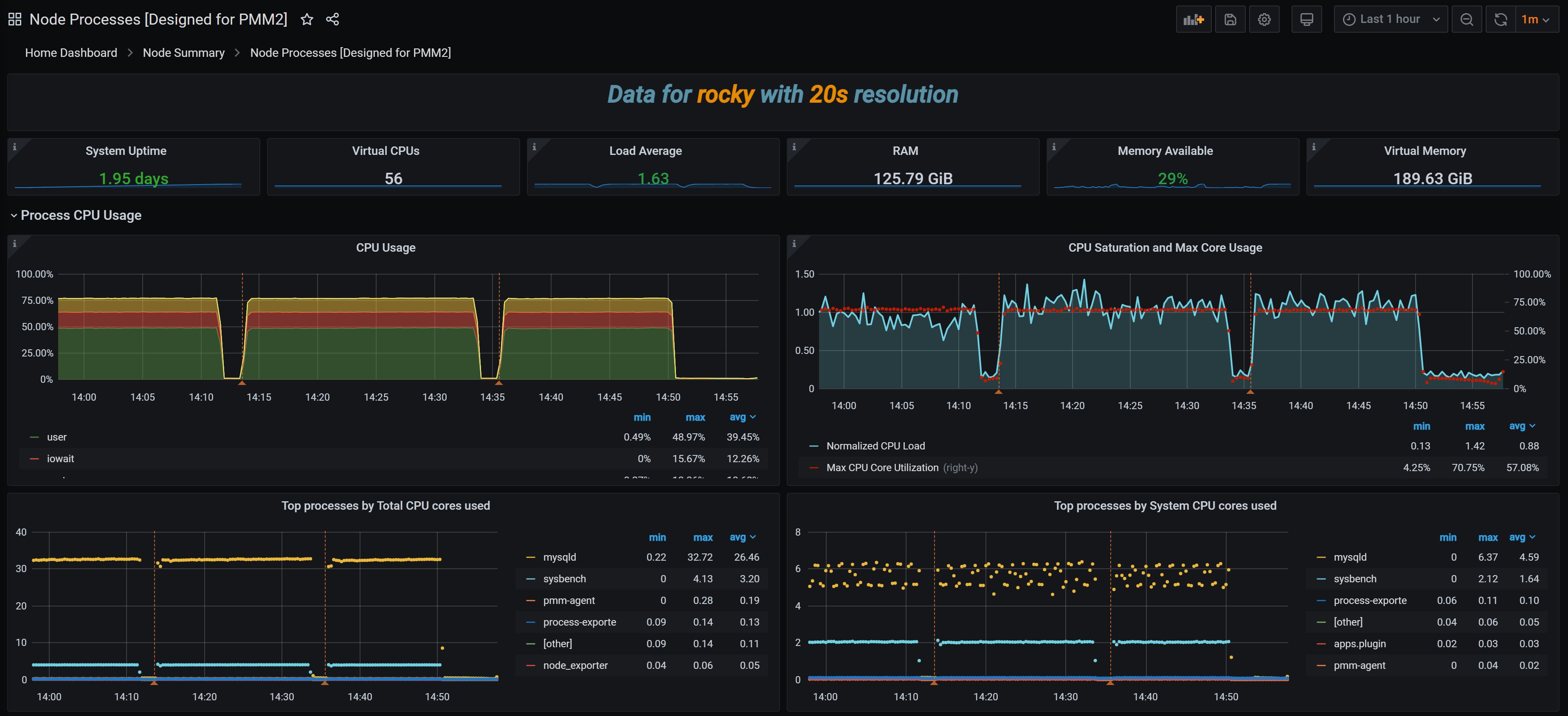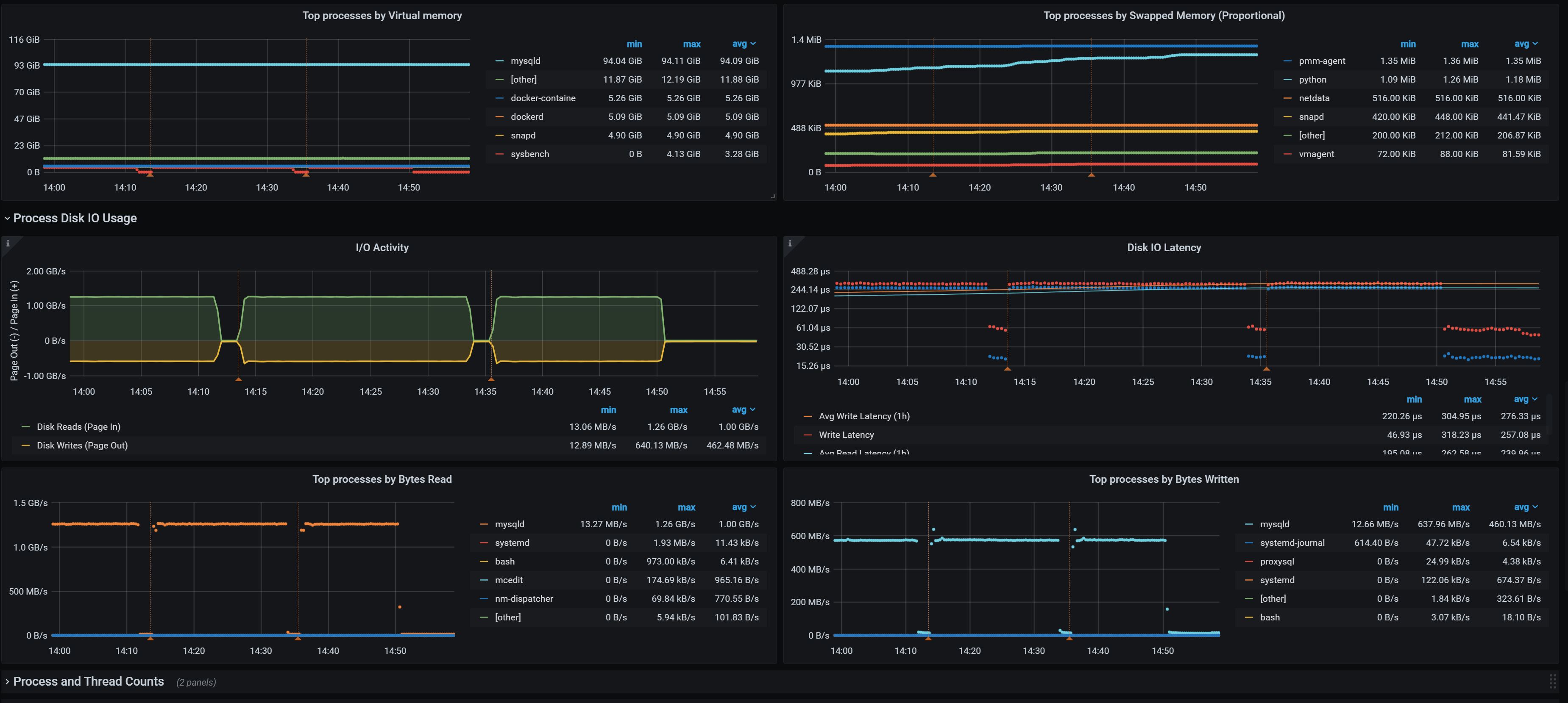 Provides insights about processes running on Linux host, such as Per Process CPU and Memory Usage, Disk IO, Process status etc To be used with Percona Monitoring and Management v2 (PMM2)