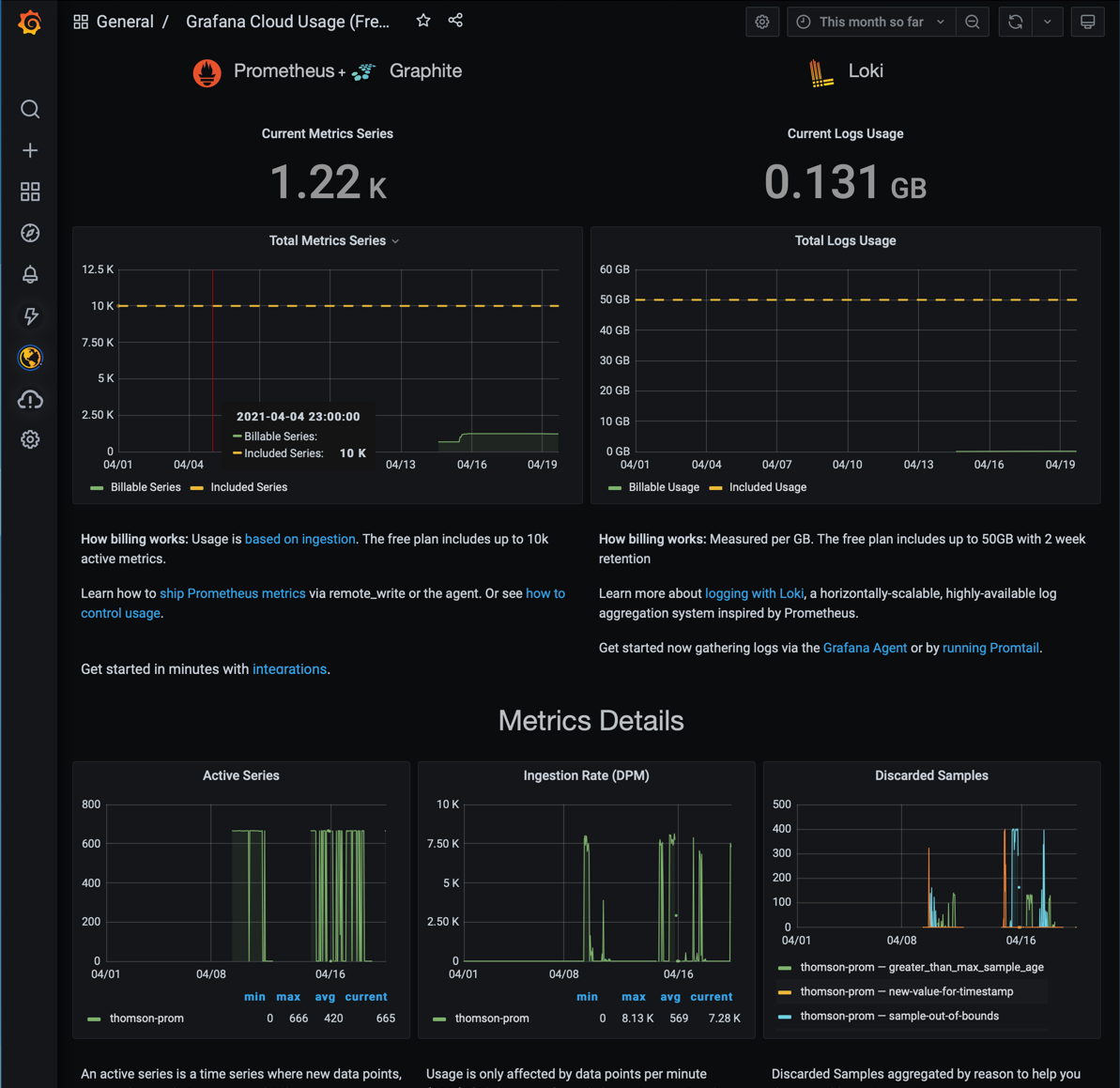 This dashboard was designed to give Grafana Cloud Free Tier customers insight into the data used. It provides visualizations of relevant information such as the number of active series, current ingestion rate, and current series usage. It also gives insight into any series that were discarded upon ingestion due to a variety of reasons.