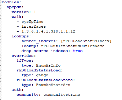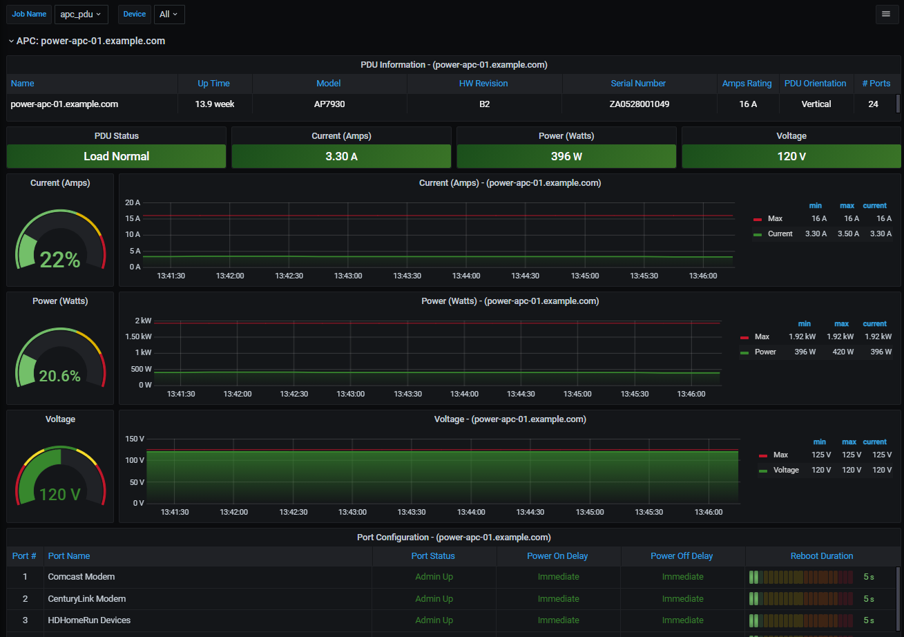 This dashboard utilizes Prometheus and the snmp_exporter to gather various statistics from APC PDU Model 7xxx. It was created using AP7930. This template is not compatible with 8xxx models as they use different OID's.