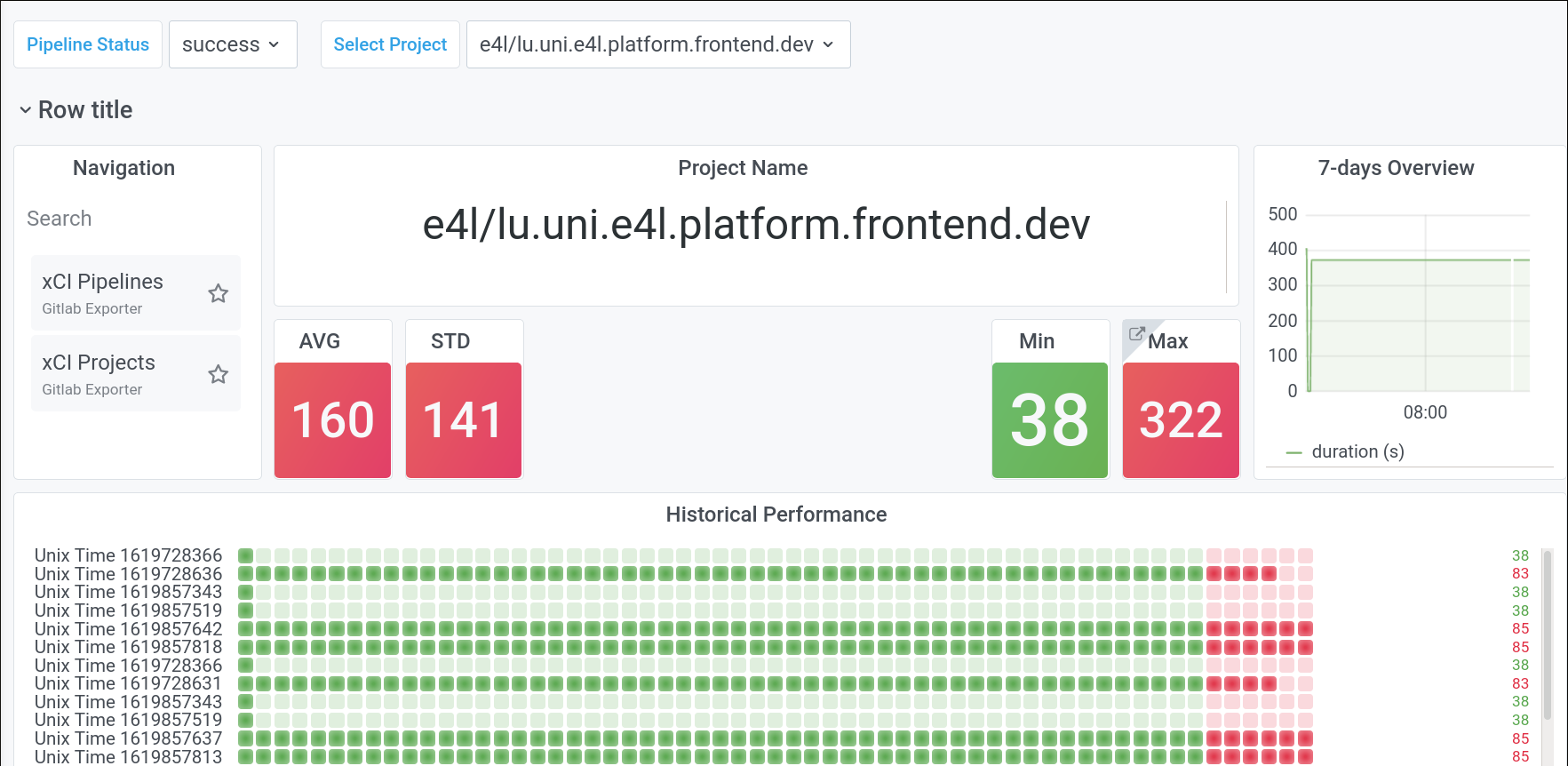 The xCI Pipelines dashboard uses the data source to create a Grafana dashboard with the panel.