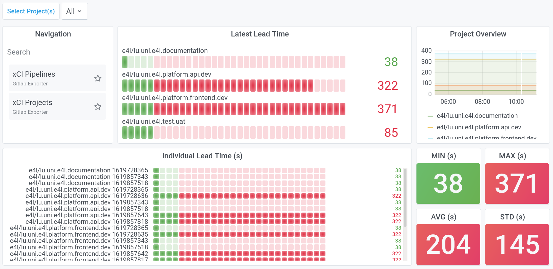 The xCI Projects dashboard uses the data source to create a Grafana dashboard with the panel.