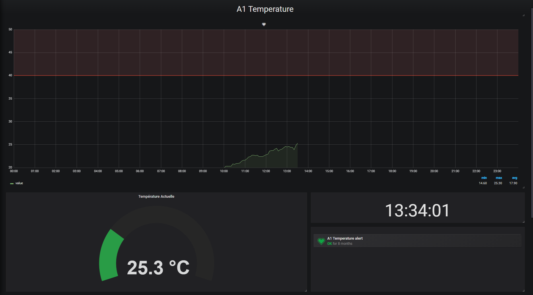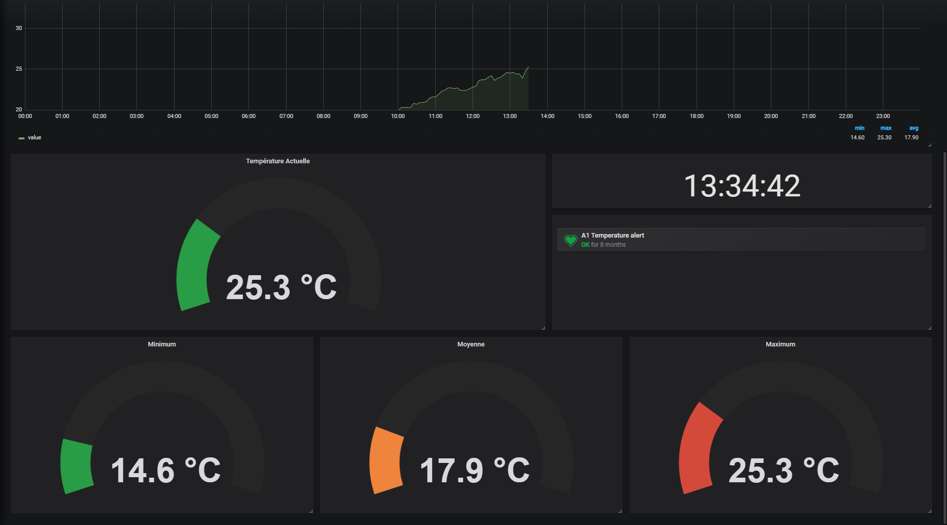 The Temperature Monitoring dashboard uses the mysql data source to create a Grafana dashboard with the alertlist, grafana-clock-panel, graph, singlestat and text panels.