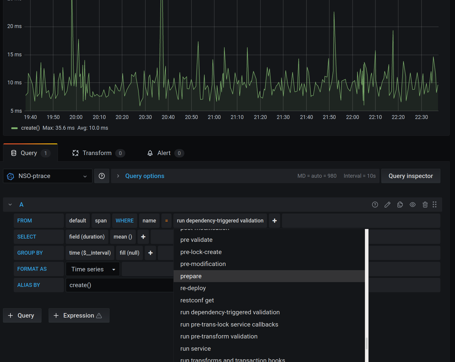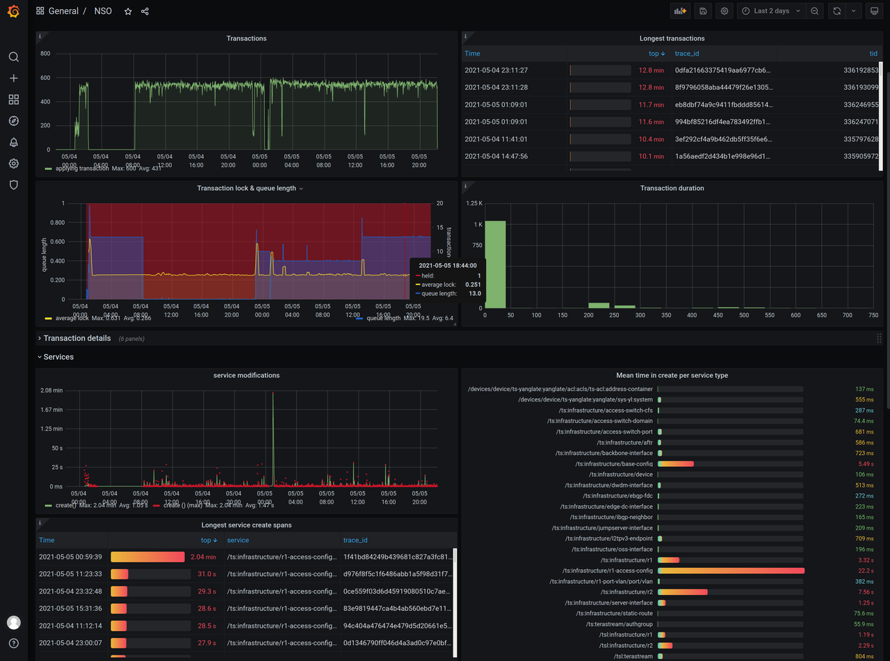 This dashboard graphs the data that can be exported from a Cisco NSO system using the opentelemetry-exporter package available at https://gitlab.com/nso-developer/opentelemetry-exporter/