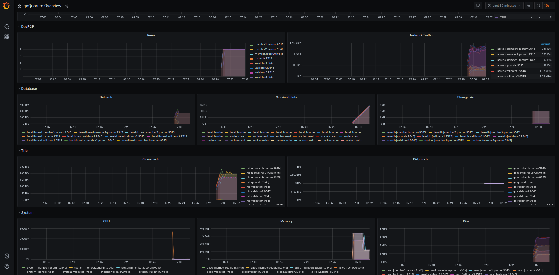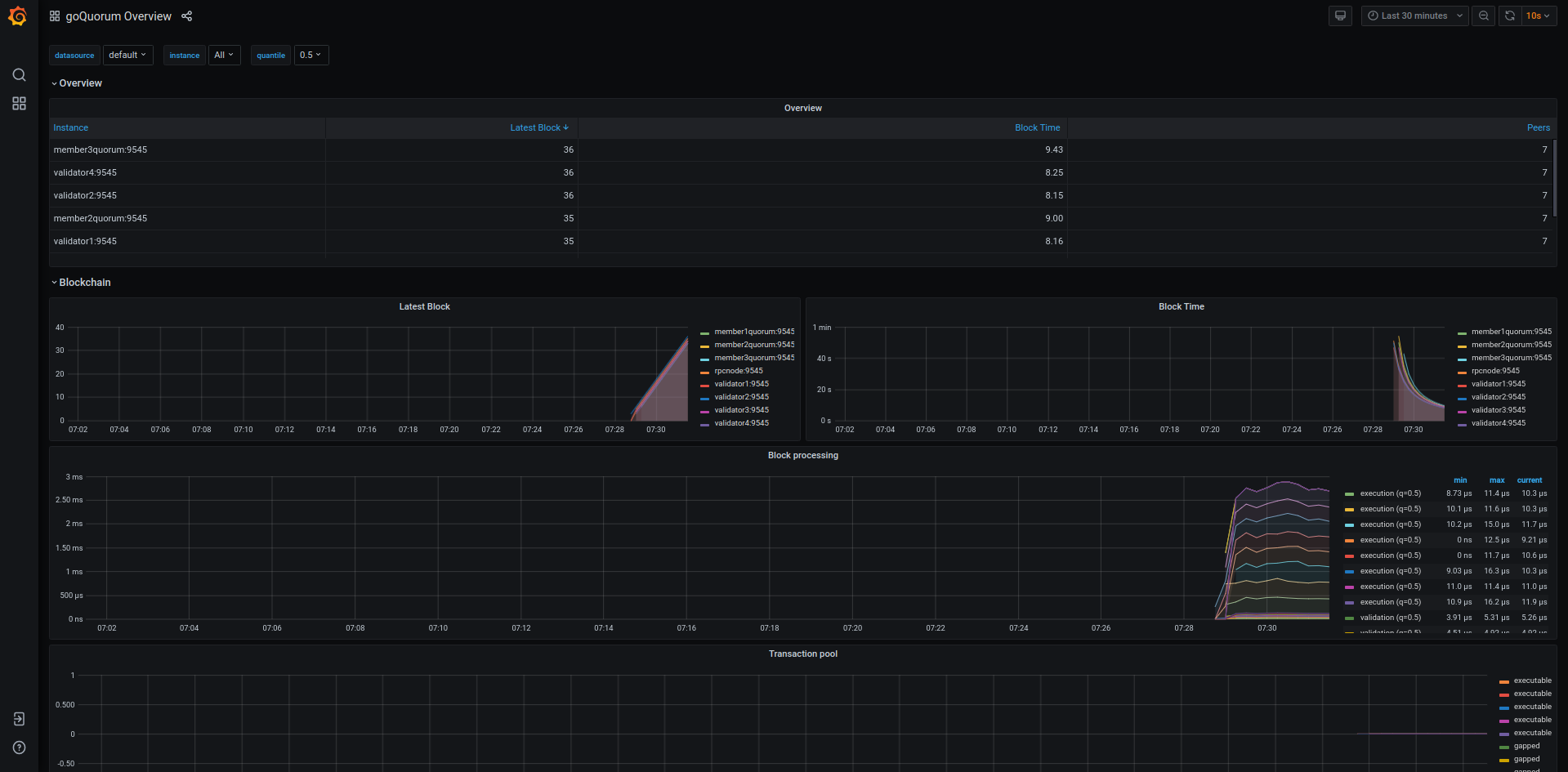 Provides a dashboard for monitoring a goQuorum Ethereum node. The required data is exported directly from GoQuorum to a Prometheus data store. See the documentation on how to configure GoQuorum and Prometheus.