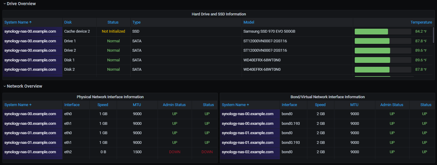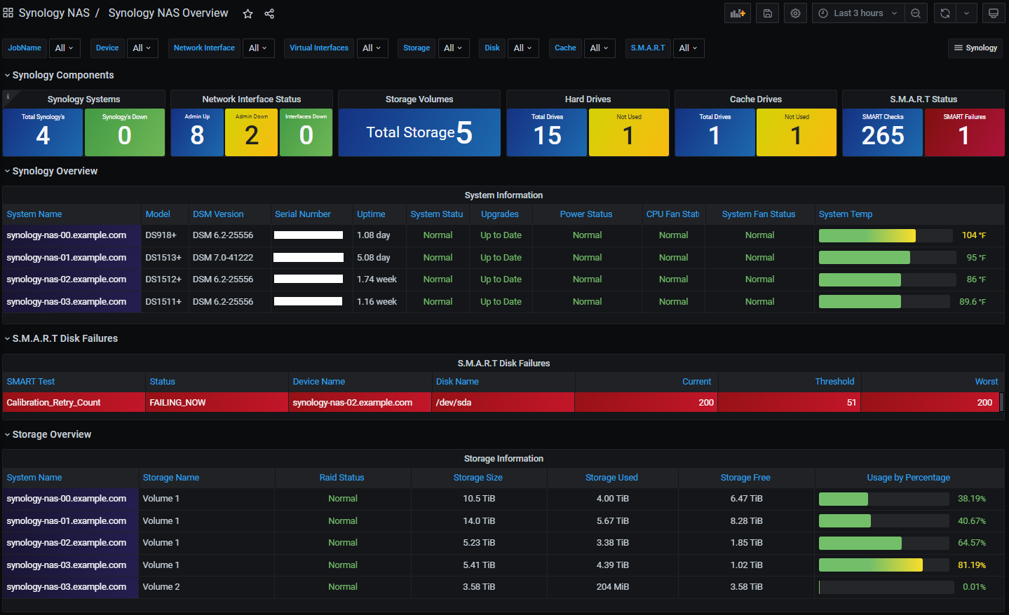 The Synology NAS Overview dashboard gives an overall glance at multiple Synology NAS systems and their operational status.