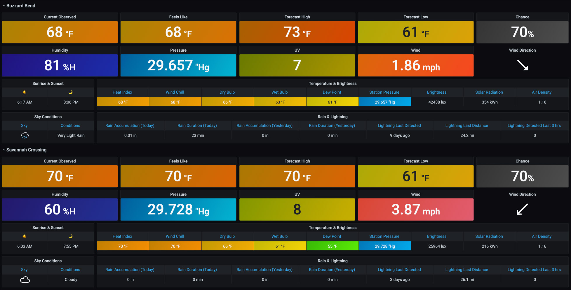 WeatherFlow Collector provides multiple ways of collecting data from the WeatherFlow Tempest, Air, and Sky weather systems. These Grafana dashboards offer visualizations in real-time for current conditions, derived metrics, and forecasting.