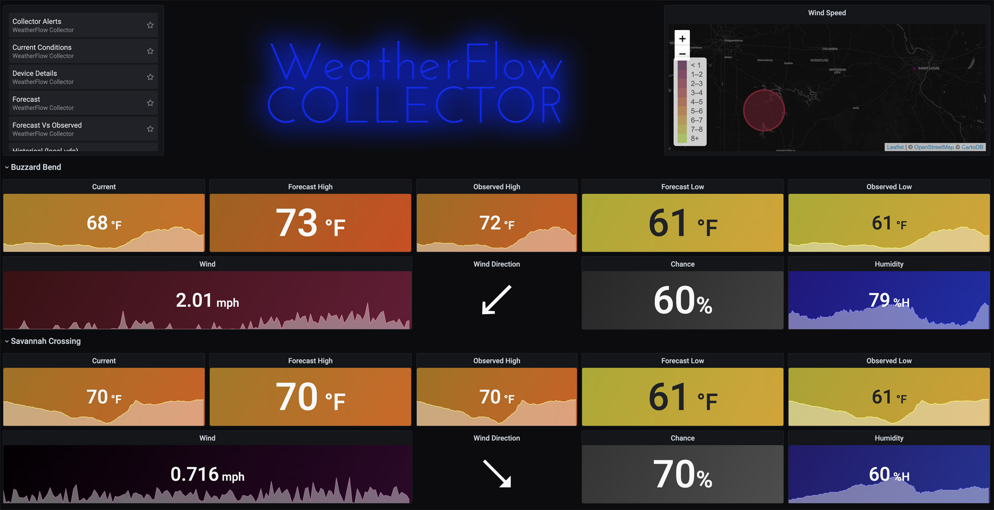 WeatherFlow Collector provides multiple ways of collecting data from the WeatherFlow Tempest, Air, and Sky weather systems. These Grafana dashboards offer visualizations in real-time for current conditions, derived metrics, and forecasting.